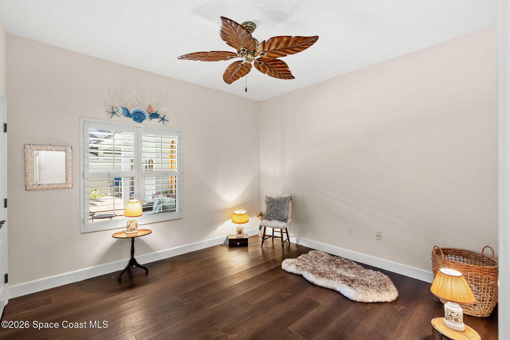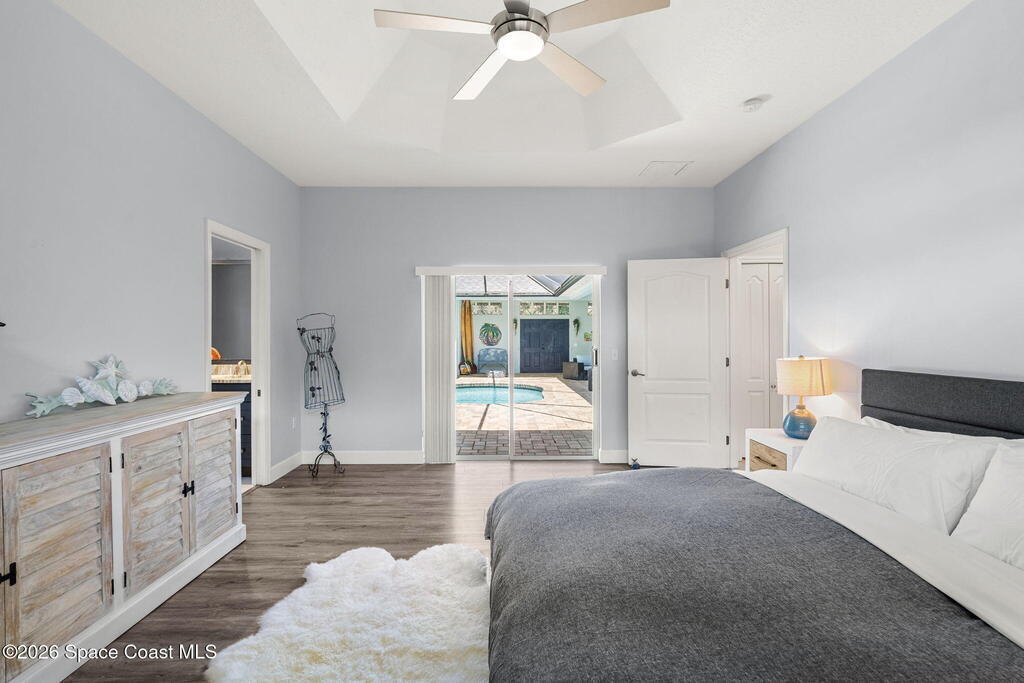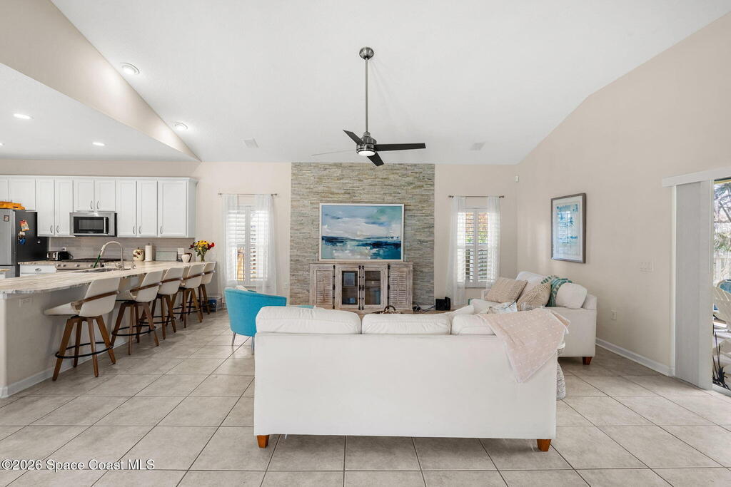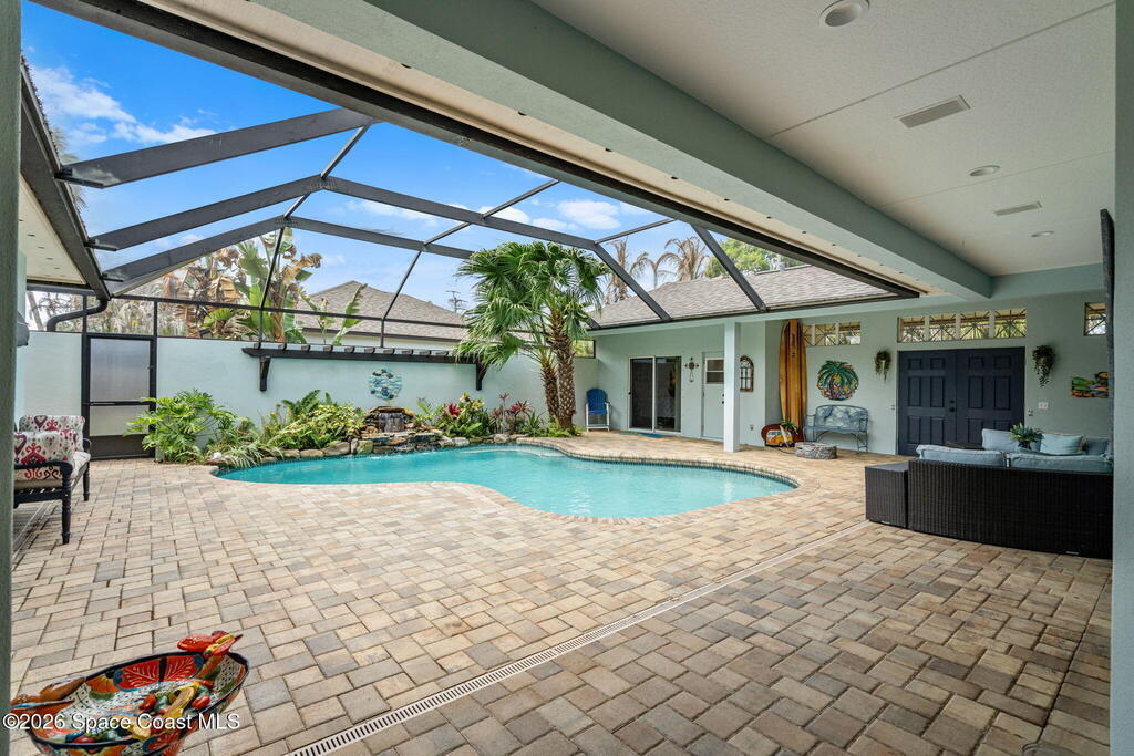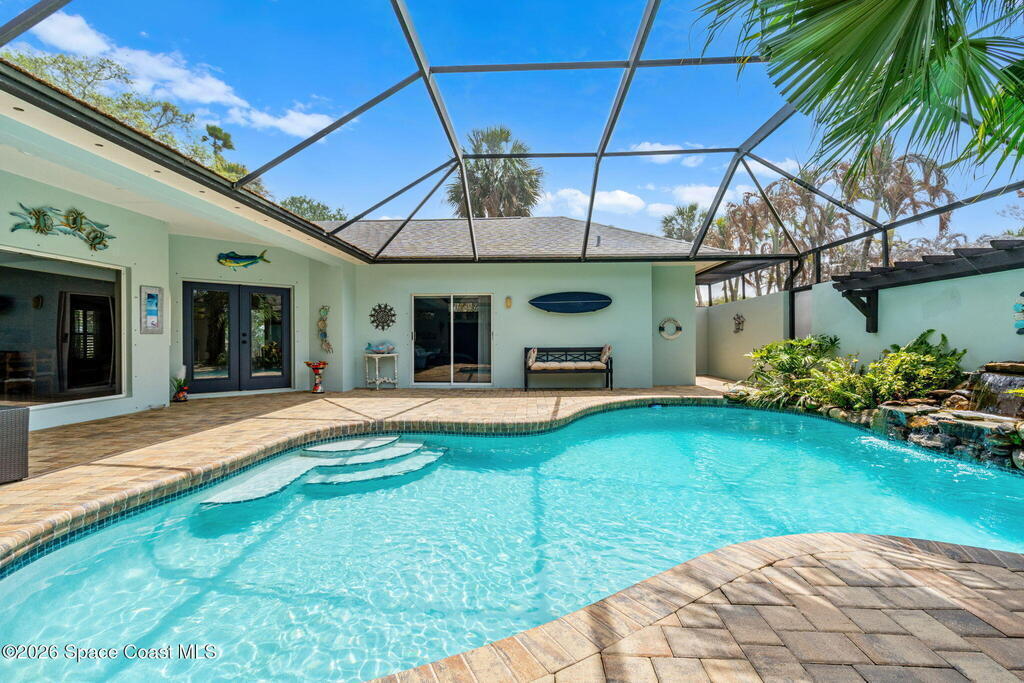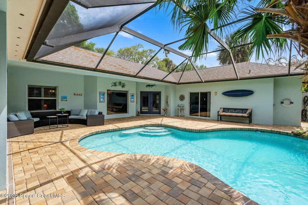Private coastal oasis--this stunning courtyard pool home offers the ideal blend of comfort, style, and versatility. The main residence features 3 bedrooms and 2 baths with a bright, open floor plan, soaring vaulted ceilings, and seamless indoor-outdoor living. A separate guest suite with private entrance-- with its own bedroom/office and full bath--makes this home perfect for visitors, multi-generational living, or a private workspace. The spacious primary suite boasts a beautifully updated en-suite bath, creating a relaxing retreat. At the heart of the home, the renovated kitchen shines with a gas stove, custom cabinetry, quartz countertops, and a large island that flows into the dining area. Step outside to your enclosed saltwater pool paradise. The expansive covered lanai extends your living space year-round, perfect for entertaining or unwinding in the coastal breeze. Recent upgrades provide peace of mind, including a 2017 roof, 2018 HVAC, Generator, shutters, pool resurfacing.