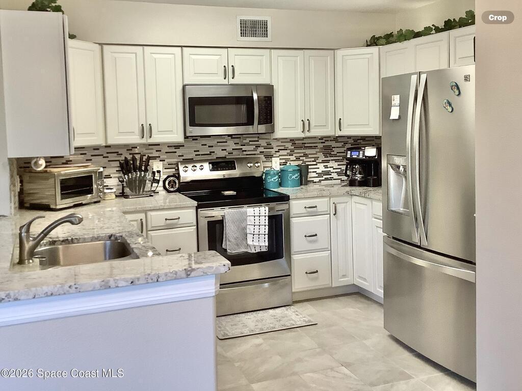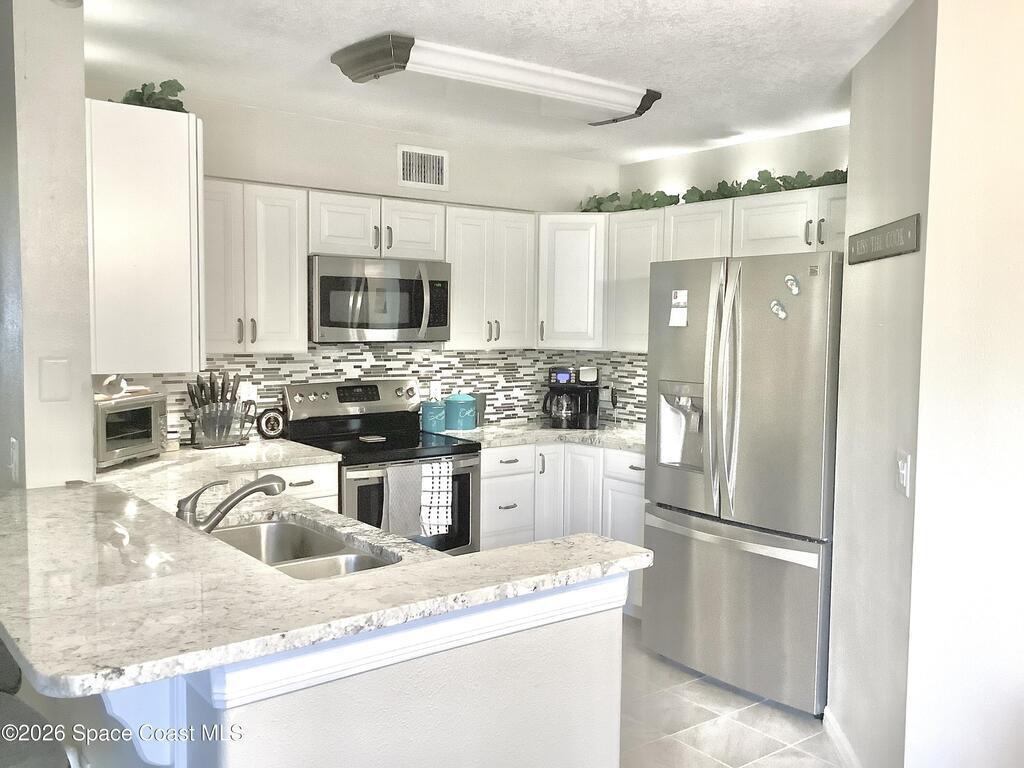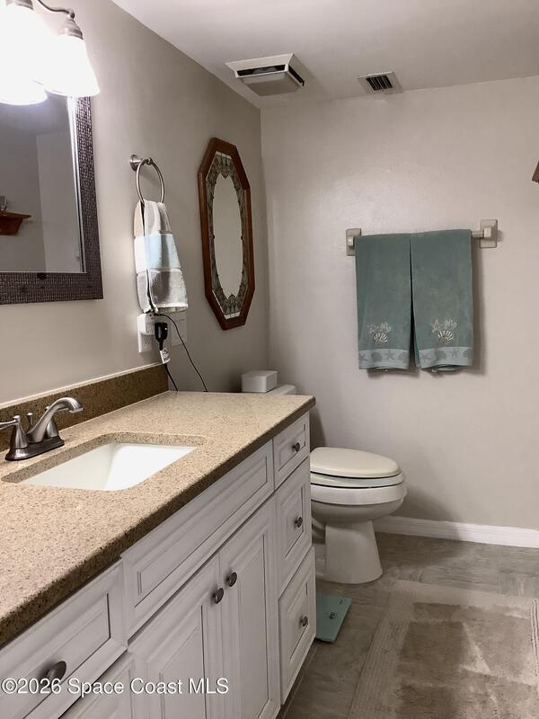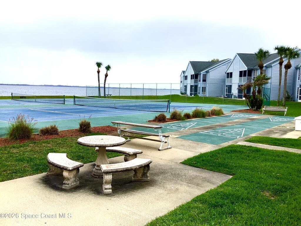 Welcome to Sunrise Landing featuring this lovely 3 bedroom, 2 bath, first floor, end unit. Relax on your very private screened in porch. Walk right outside for a perfect front row seat to rocket launches and dolphins playing in the Indian River. The kitchen features granite countertops with beautiful cabinetry and lots of storage. There is also a wet bar cabinet w/granite. Newer HVAC (2024). Residents at Sunrise Landing enjoy access to a range of amenities including 2 pools w/hot tubs, 2 saunas, 2 fishing piers, tennis/pickleball courts, shuffleboard, vehicle car wash area and more. HOA includes cable TV, internet, water, trash and ground maintenance. Located not far from beaches, Kennedy Space Center, Port Canaveral, shopping (Publix/Walgreens across the street), restaurants and a short 40 minute drive to Orlando International Airport. Great opportunity to live the enjoyable Space Coast life, perfect investment or snowbird retreat.