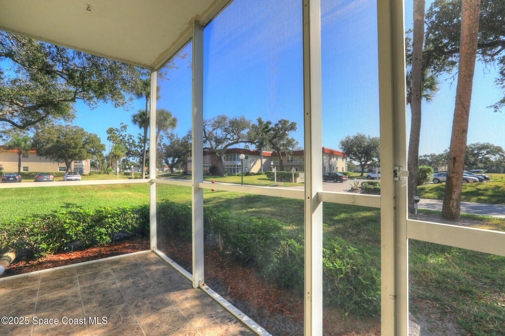 Charming first-floor condo with golf and green space views, plus a private screened porch. Tile flooring throughout the main living areas with carpet in the bedroom. The inviting kitchen features tiled countertops and backsplash. Updated windows and a newer front door with built-in blinds let the sunshine spill in. Both baths have newer vanities with granite tops. The screened porch offers tiled flooring and a roomy storage closet. Well-kept 55+ community with pools, tennis, pickleball, fitness room, shuffleboard, clubhouse, and a full calendar of activities. Water, sewer, trash, and basic cable are included.