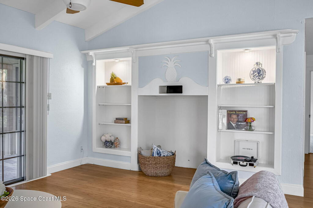 Welcome to Quail Ridge Townhomes! This well-maintained half duplex has a very large enclosed porch area in the back as well as a large front patio. The entry and kitchen feature tile flooring. Bamboo flooring flows throughout the main living areas, with the comfort of carpet in the bedrooms and office area.Soaring cathedral ceilings with exposed beams create a bright, open feel, complimented by a built-in entertainment feature in the living room. One of the bedrooms include custom built-in bookshelves, perfect for work or study. More highlights include a 2-car garage, a new roof installed May 2025, and AC 2023, water heater 2020. Enjoy community amenities including a clubhouse, pool, and tennis courts. The storage area can even store your boat, trailer, OR RV. Conveniently located across from Wickham Park, offering community events, walking trails, sports fields, and more!