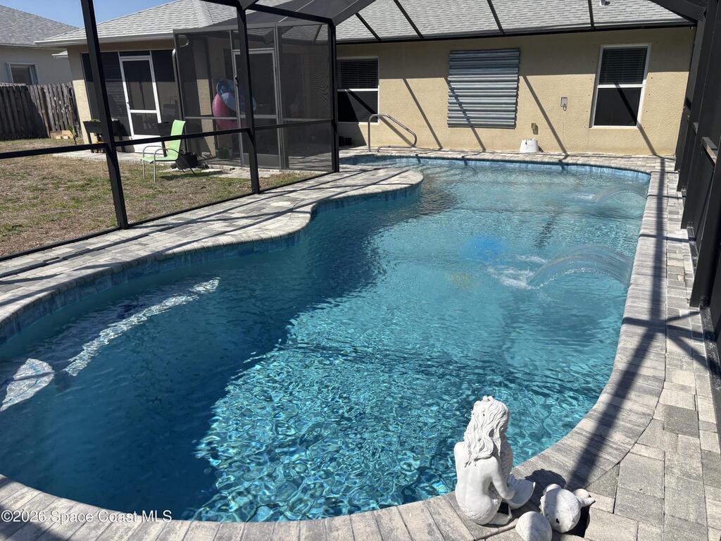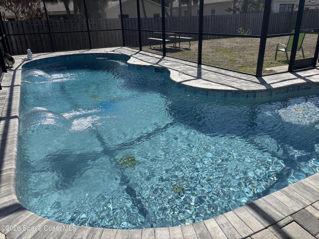 Beautiful pool home ready for its new owners! 2025 Roof. Step through the elegant glass front entry door and instantly feel at home. The spacious, updated floor plan features soaring vaulted ceilings and lots of natural light, creating a bright and inviting atmosphere. The designer kitchen truly stands out showcasing 42'' cherry-glazed cabinets with crown molding, stunning granite countertops and a large island with added storage. Enjoy conveniences like soft-close hinges and a newer four-piece stainless steel appliance package featuring a convection oven. Additional highlights include premium laminate flooring in the living, dining and family rooms, decorative plant shelves, an arched walkway, interior laundry room complete with sink and a surveillance and alarm system. Step outside and embrace Florida living at its best. Cool off in the screened-in, in-ground pool or unwind on the truss-covered porch while listening to the soothing waterfalls. City water/sewer, fully fenced yard.