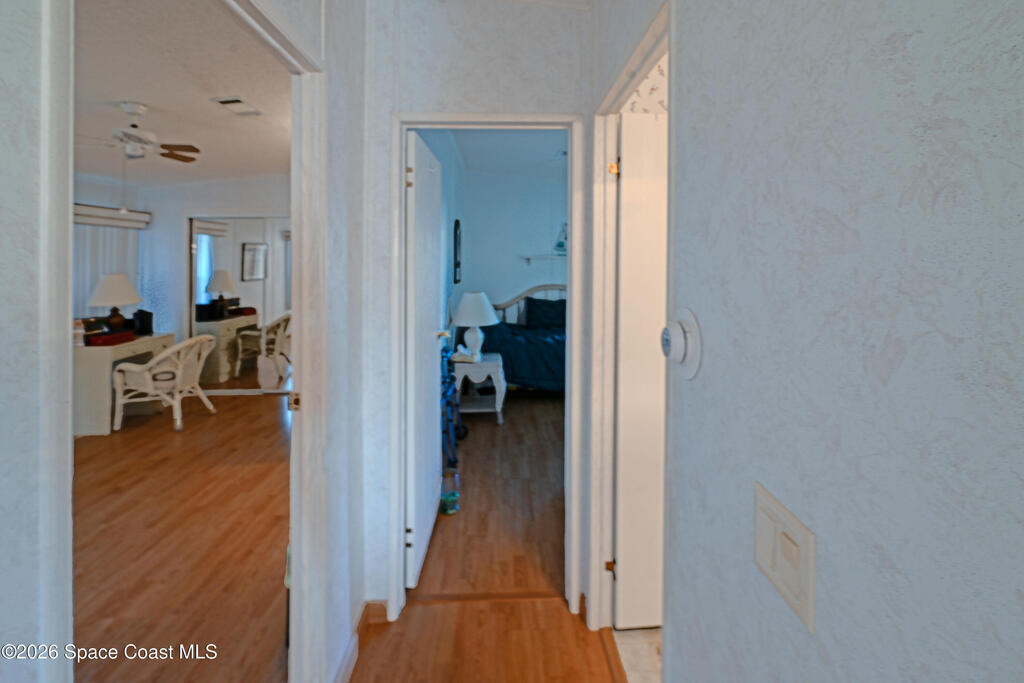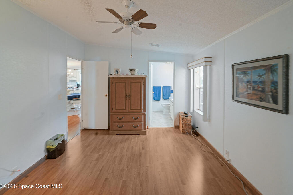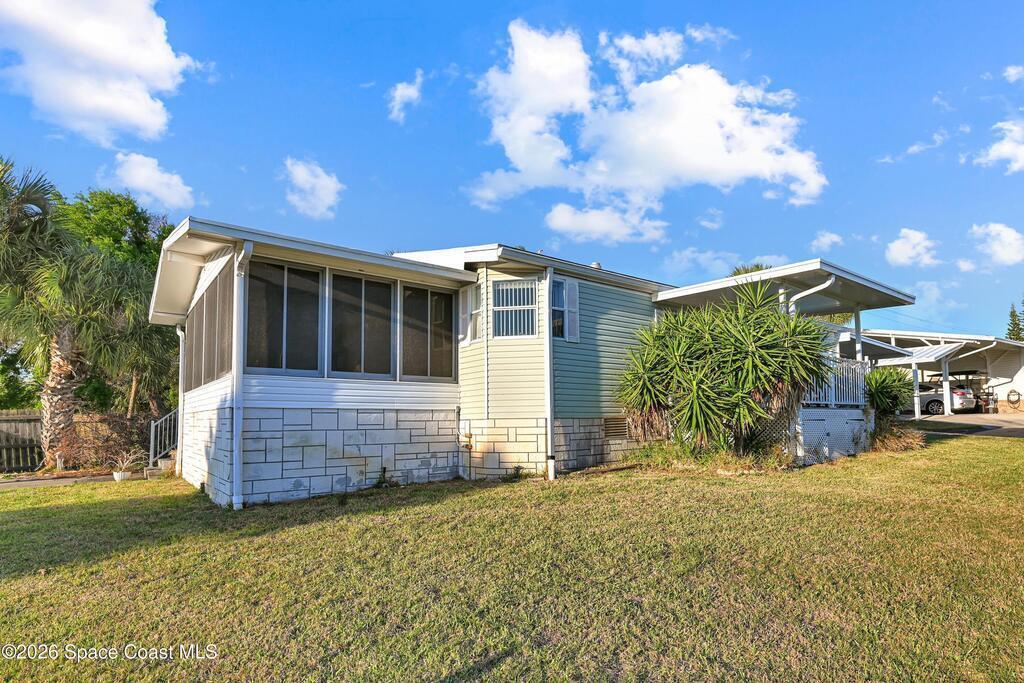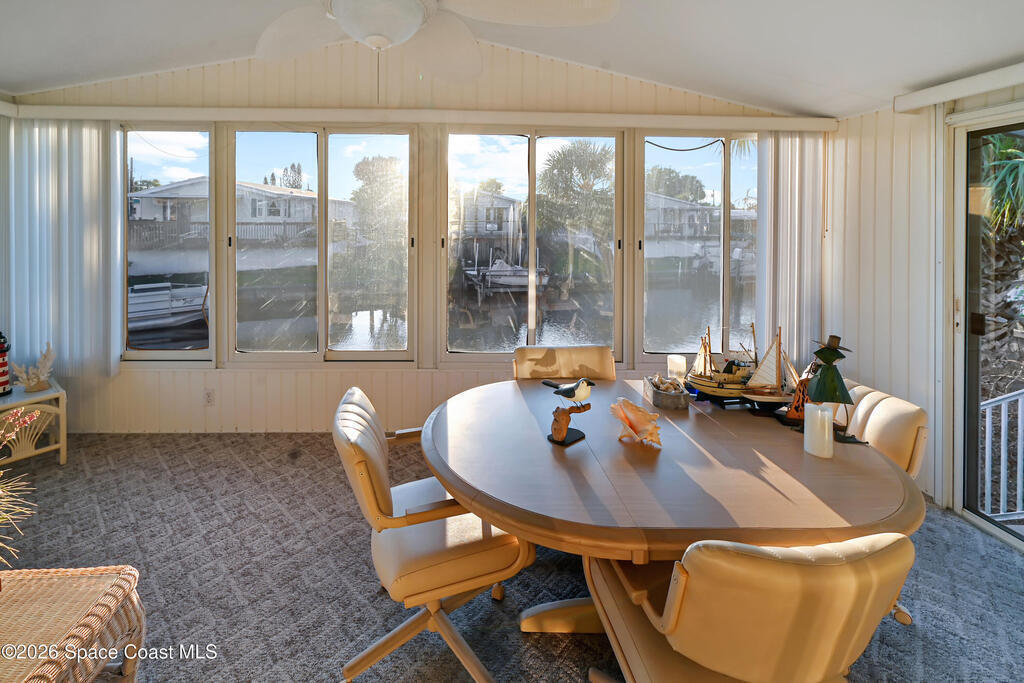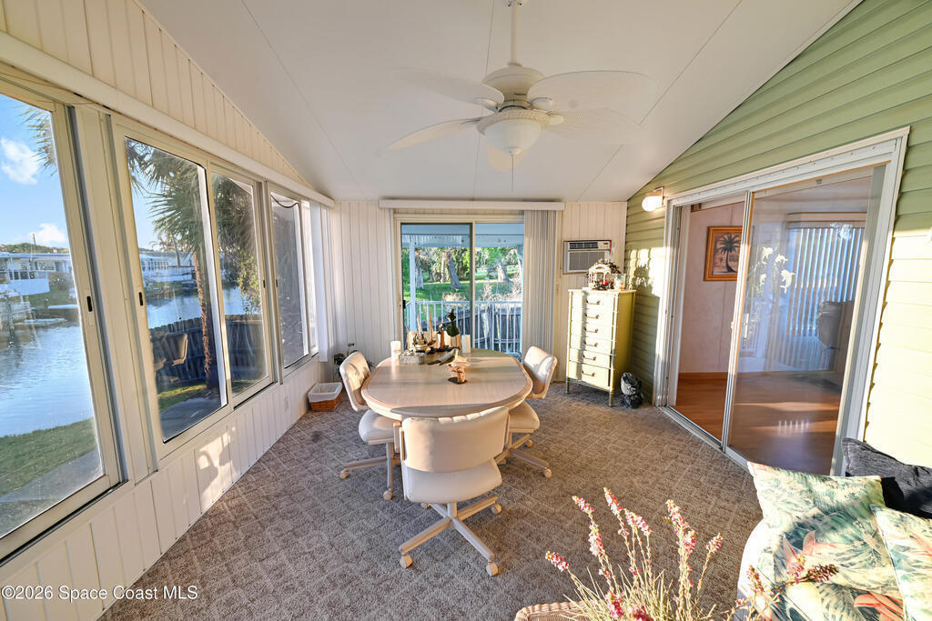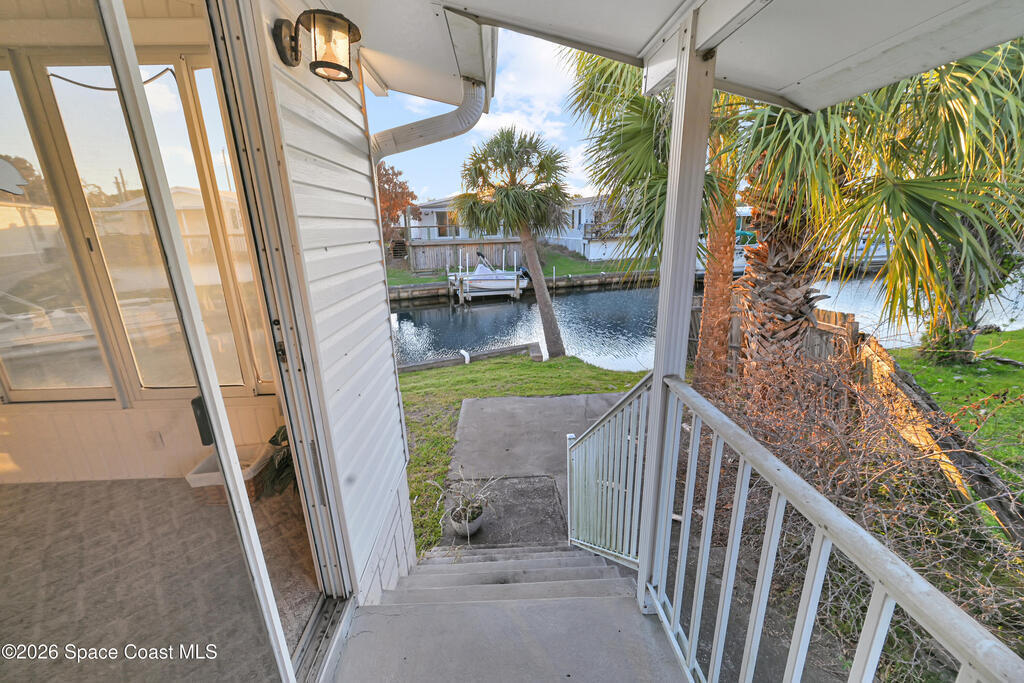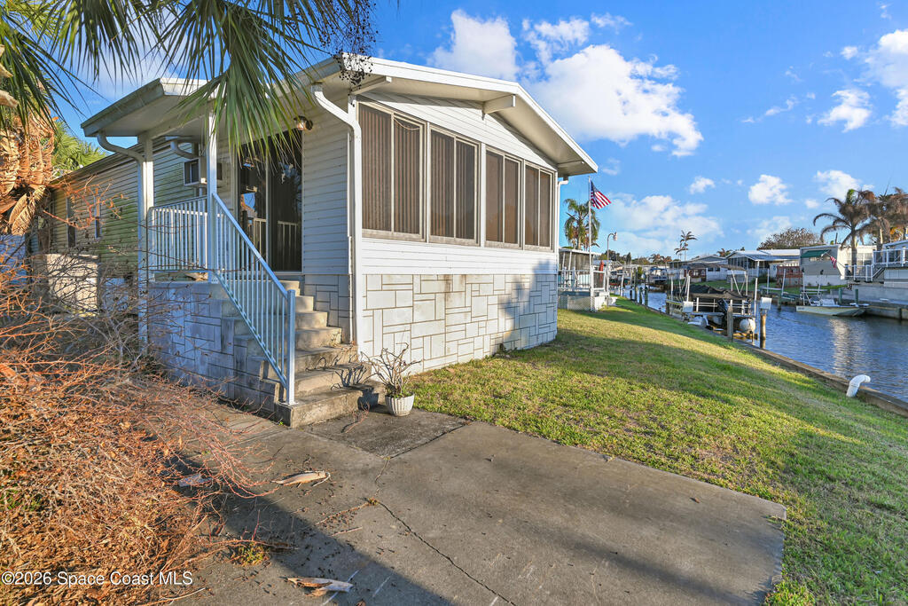 Bring your boat! Prime waterfront location with this home positioned as the furthest north residence on the east side of the waterway and situated at the end of a cul-de-sac in a co-op community. This charming 2-bedroom, 2-bath home offers a spacious layout with ceiling fans in both bedrooms and a primary suite featuring a walk-in shower with grab bar. The kitchen provides ample counter space and abundant cabinetry, while the indoor laundry room includes a washer and dryer for added convenience. Enjoy your morning coffee on the front porch, or relax in the Florida room with ceiling fan overlooking the waterway. The home also features a storage room with electricity. Furniture is included, making this home move-in ready. The community features shuffleboard courts, bocce courts, a heated pool, dog park, clubhouse, and a boat/kayak launch. The active Turkey Creek Social Club offers plenty of opportunities to socialize and enjoy the Florida lifestyle. View today!