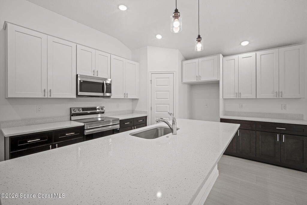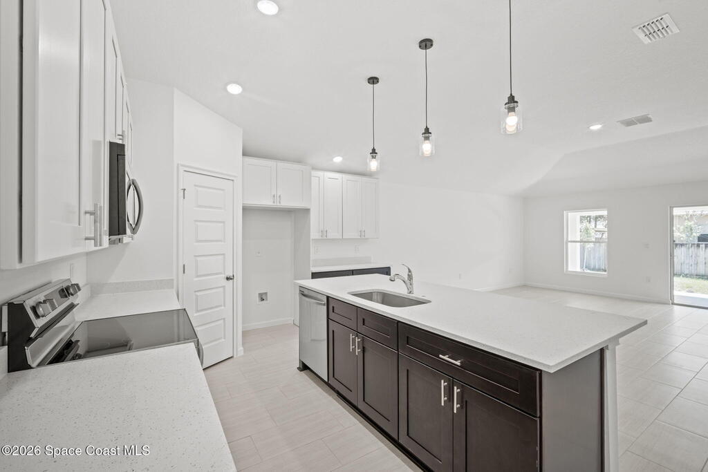 3% SELLER CONCESSIONS! NO HOA! Luxury living at an affordable price! With 1794 SQFT of living space, to include four spacious bedrooms and two elegant bathrooms, this corner lot home offers ample space for both relaxation and entertainment. The open-concept features a modernized kitchen, complete w/ 42'' upper cabinets, Samsung stainless steel appliances, large island, dry bar, & highlighted with quartz countertops. The master suite boasts an upscale bathroom, with Corian solid surface counters, custom fixtures, and standalone shower w/accented tile and flooring. Additional bedrooms are generously sized, ideal for guests or a home office. Other features are custom tile throughout (NO CARPET!), custom efficient fixtures and LED lighting, prewire for fans in all bedrooms, storm shutters, double pane windows, hurricane rated garage door, and covered lanai patio for outdoor gatherings. This home is on city water and septic. 1 yr bumper to bumper/2-10 Builder warranty included.