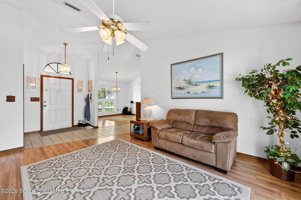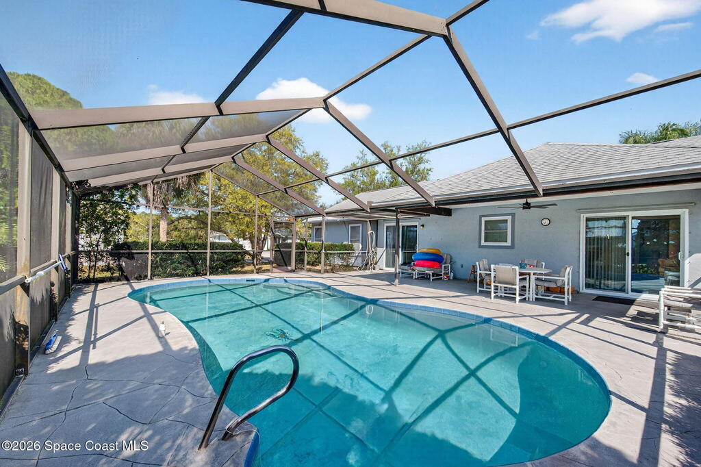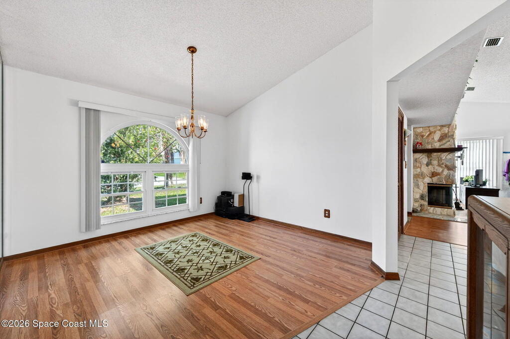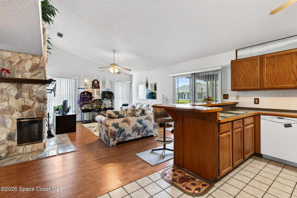 Welcome Home! Sitting pretty on a raised corner lot, this home brings the vibe w/ a sparkling south-facing pool made for sun-soaked days & easy Florida living. Inside, a split floorplan delivers the perfect mix of privacy & flow, while soaring vaulted ceilings elevate the space & make it feel open, bright & inviting.The primary suite offers your own retreat w/ double vanity, soaking tub, walk-in shower, large closet & separate commode. The kitchen is the heart of it all w/ real wood cabinets, SS appliances, breakfast bar & skylight, all overlooking the main living space & pool. The living room brings the cozy w/ a stone gas fireplace, while tile in main areas & natural light throughout tie everything together.Big-ticket updates? Done. A/C 2017, HWH 2025 & full hurricane impact doors & windows. Indoor laundry, sprinkler system & more.Morning coffee by the pool, friends over at sunset, fireplace nights when it cools off--this one just feels right.