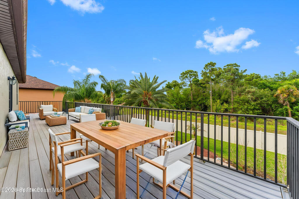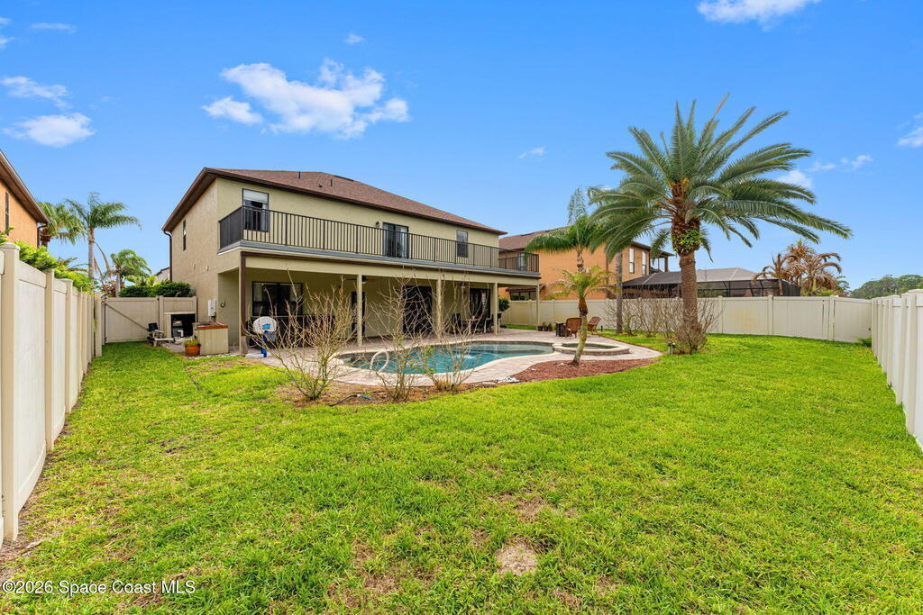 Located in the gated community of Eagle Harbor, this expansive 5-bedroom pool home offers a rare blend of versatility, comfort, and true Florida lifestyle living. With over 3,600 square feet, the thoughtfully designed floor plan adapts effortlessly to the way you live--featuring formal living and dining areas, a dedicated office or flex space, and an open-concept kitchen and family room that seamlessly connects to a sun-filled Florida room currently enjoyed as the main dining space.Upstairs, the home truly shines with a spacious bonus room featuring sliders that open to an impressive 500 sq ft deck--perfect for taking in elevated views of the backyard, enjoying sunset skies, or even catching a rocket launch. A dedicated movie room with high-resolution projector, surround sound, and oversized reclining seating creates the ultimate at-home theater experience.Step outside and you'll find your own private retreat. The fenced backyard showcases a sparkling pool and spa with a built-in