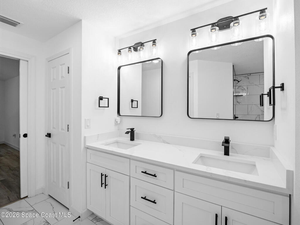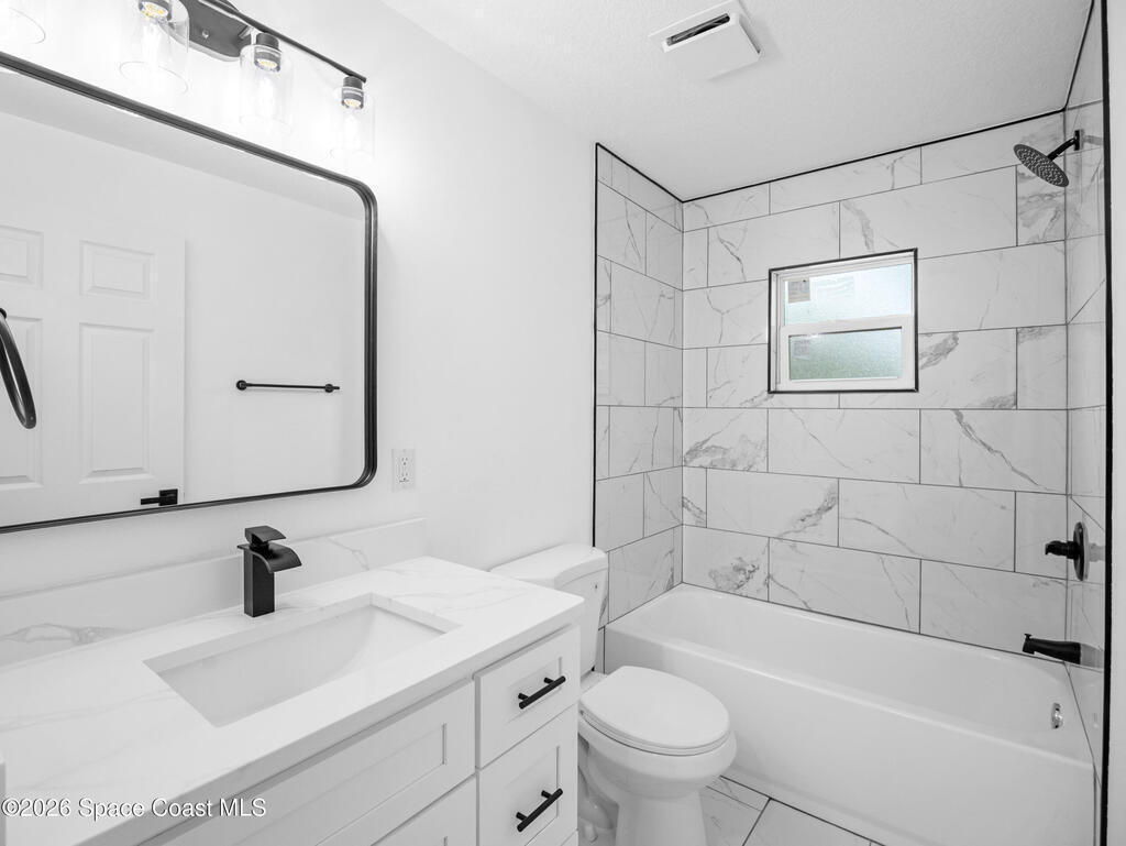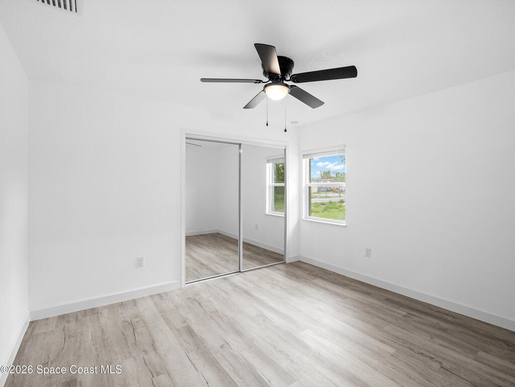 Brand new construction home centrally located in Mims! All hurricane impact windows and sliders! When you walk through the front door you come into an open concept design with a spacious living room, dining room & kitchen with an unique ''L'' shaped island giving extra counter space and cabinet space, quartz countertops and white shaker, soft close cabinets. Corner pantry with plenty of storage. The dining room has a sliding door which brings in great natural light and looks out to the backyard with no neighbors behind you! The primary suite has a generous size bedroom, walk-in closet, linen closet, double vanity and an oversized shower with a sitting bench. Split floor plan with two more bedrooms and a bathroom on the other side of the house with a spacious laundry room, that has a linen closet and leads to the garage. This property is on a quiet dead end street for privacy and peace.