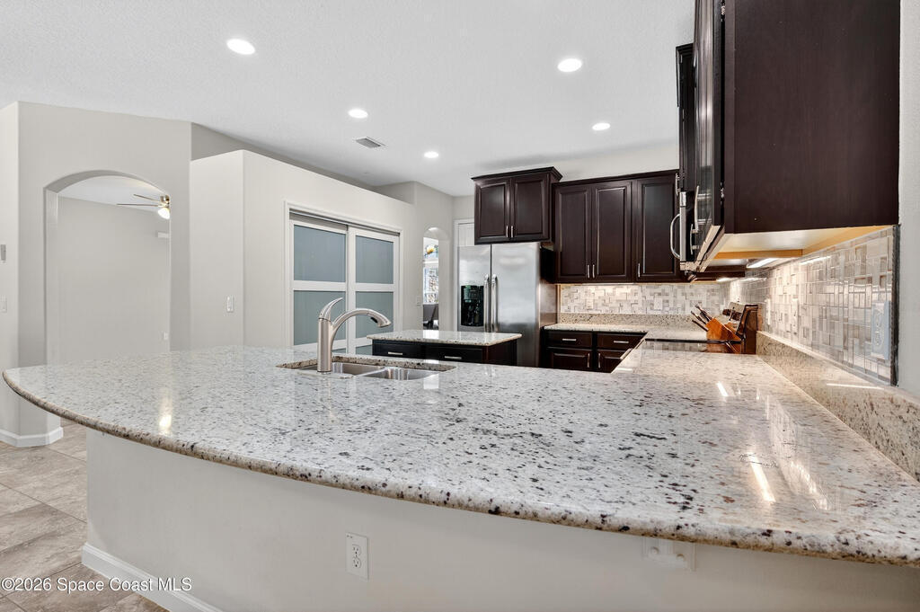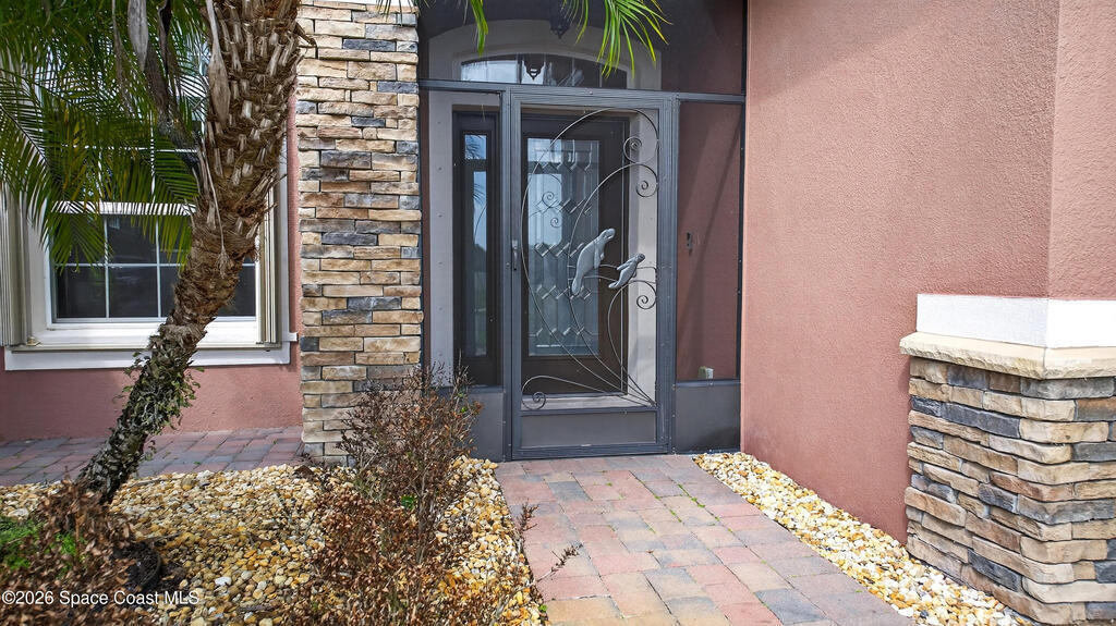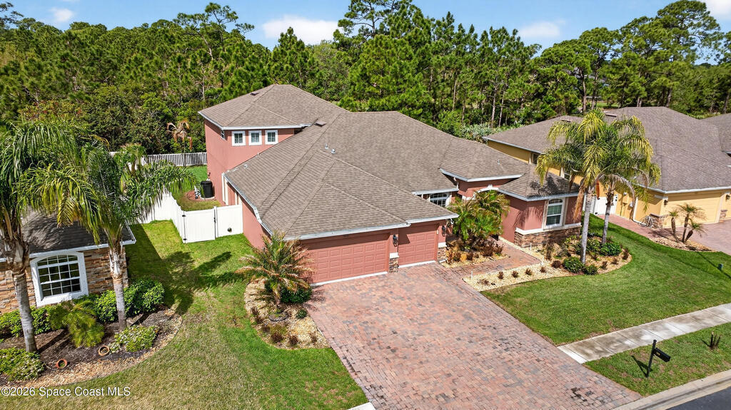 Located in a desirable gated community, this spacious 3,406 sq ft pool home offers 5 bedrooms, 4 baths plus a 3 car garage and is perfectly designed for comfortable living and entertaining. Situated on a private preserve lot with dramatic stone front accents and a fenced backyard, the home features formal living & dining areas, a large family room, plus a versatile upstairs loft & bonus room with LVP floors. The well appointed kitchen includes granite counters, stainless apliances, undercabinet lighting, modern backsplash, spacious pantry & beautiful glass cabinet accent doors. A separate sitting area in the primary suite and dual closets and vanities make it a private retreat. Top it off with rounded drywall corners, security cameras, and accordion shutters on the front & sides, with standard shutters on Lanai. Brand new waterheater installed in 2026. Enjoy resort-style living with Bayside Lakes Ammenities including Pool, Clubhouse, Park, Tennis Basketball & Fitness. It Won't Last!
