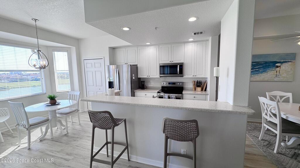 Welcome to The Terraces at Heritage Isle, widely regarded as one of the premier 55+ resort-style communities in Viera, Florida. This beautifully remodeled lakefront condo offers 1,235 square feet of elegant living space, featuring 2 bedrooms, 2 bathrooms, and soaring ceilings, all located on the highly desirable quiet 4th floor with elevator access.From the living room, kitchen, and screened lanai, enjoy breathtaking panoramic views of the tranquil lake and the Duran Country Club Golf Course--one of the best vantage points in the community. Designed in a light, coastal style, this condo has been thoughtfully updated with top-of-the-line, all-climate waterproof LVP flooring throughout, soft white designer wall tones, and high-end appliances. The unit is fully furnished with tasteful, upscale coastal furniture and includes a large smart TV, making it truly move-in ready.The well-planned floor layout begins with a spacious foyer and hallway that leads to two private bedrooms, two bath