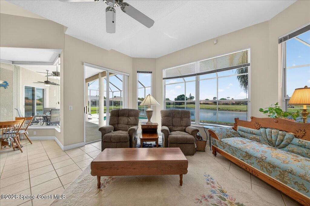 Seeking the perfect Florida coastal lifestyle on the Space Coast? Welcome to this inviting 4 bedroom, 3 bath waterfront pool home, overlooking a championship 18-hole golf course! Step through your front door into a light-filled living space where soaring ceilings and a thoughtfully designed split floor plan create an immediate sense of openness and ease-all beautifully framed by endless water views! Step outside and relax on your large screened patio, complete with heated pool and spa - your private oasis. The spacious primary suite offers a serene retreat, with a sitting area, and spa-inspired bath, featuring a jetted tub, dual vanities, separate shower and walk-in-closets. At the heart of the home, the kitchen...a chef's dream! An Electrolux Gas Range and Samsung Refrigerator boast dual ice makers-perfect for entertaining! There's a dedicated laundry center and oversized 2-car garage. Years of enjoyment await in this premier Baytree community with nearby dining, shopping & the beach!