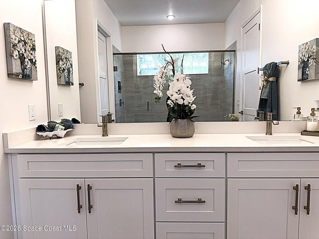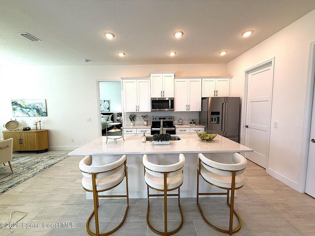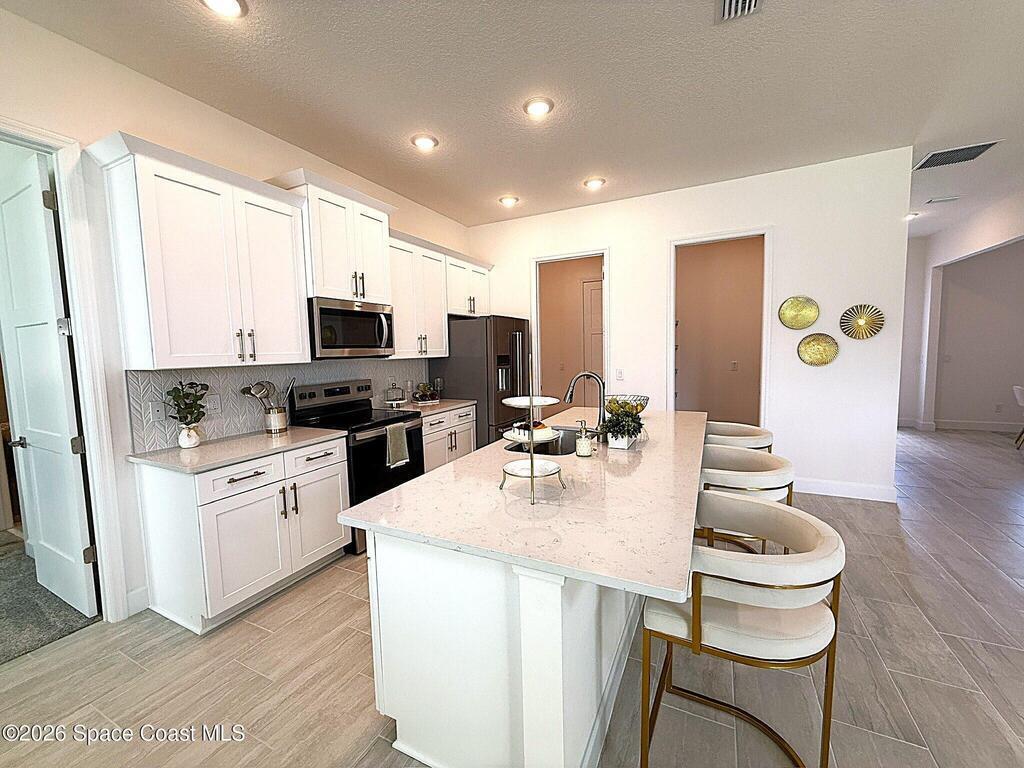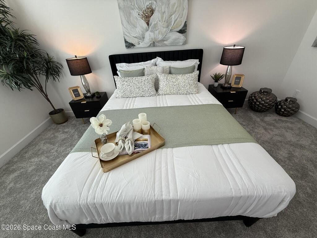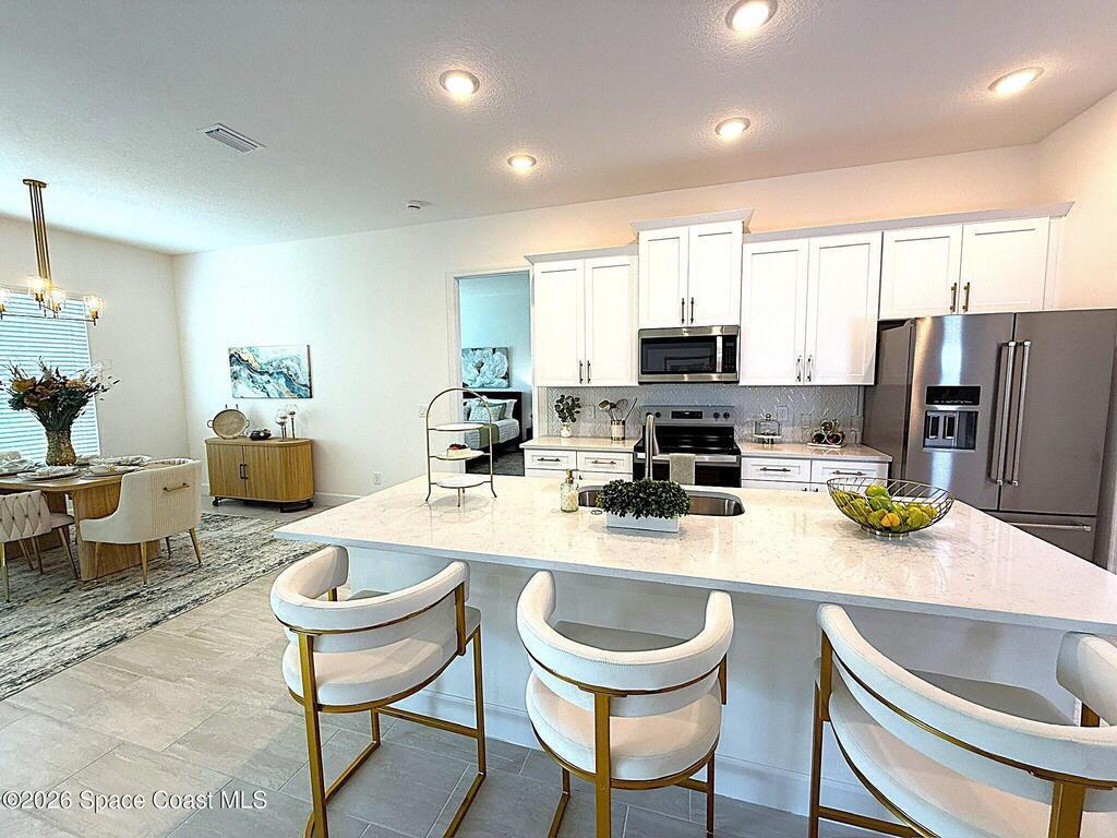 To Be Built - The Ericka 3 by a local builder. This impressive 4-bedroom, 2-bath, 3-car garage home offers 2,087 sq. ft. of refined living on city water and sewer. Designed with attention to detail, it features soaring 10' ceilings, 8' interior doors, quartz countertops, and fully tiled showers throughout. The primary suite serves as a private retreat with an oversized walk-in shower, transom window, and frameless glass enclosure. The kitchen impresses with 42'' bump-and-stagger cabinetry with crown molding, elegant backsplash, walk-in butler's pantry, and refrigerator included. The open-concept layout is ideal for entertaining, complemented by tile flooring in main areas and upgraded carpet in bedrooms. Epoxy-finished front and rear entries complete the look. Buyers may select design finishes up to a certain point in the build. Photos represent a completed spec home. Tour the finished Ericka 3 at 557 Castana Ave SE, Palm Bay 32909 before it's gone.