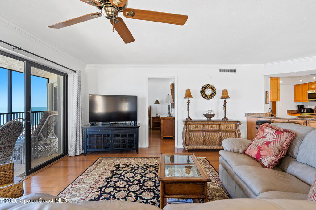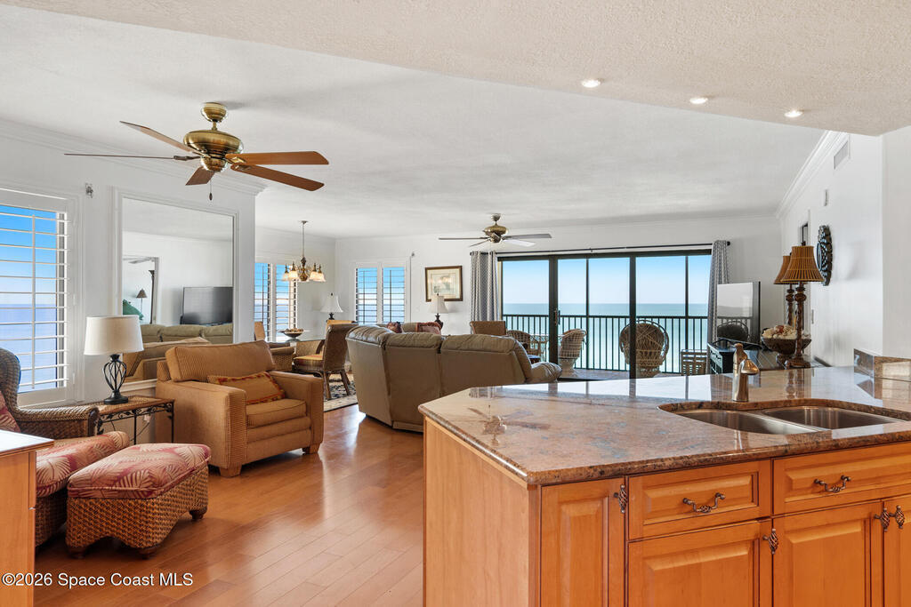 Wake up to breathtaking ocean views from this 4th-floor corner residence in Sterling House, where light-filled interiors and an open-concept design create an inviting coastal retreat. A spacious screened lanai is the perfect spot for sunrise mornings or unwinding with the soothing Atlantic breeze. The condo features an updated kitchen with granite countertops, crown molding, plantation shutters, and beautiful wood flooring throughout. Additional highlights include a tankless water heater and storm shutters (mostly electric). Convenient under-building parking with private storage adds ease. The residence may convey turn-key for effortless move-in.Live like you're on vacation every day with the turquoise ocean and pristine white sand beach just outside your door, along with a heated pool, tennis and pickleball courts, and nearby golf courses. Concrete restoration is complete--making this the perfect time to move in and enjoy this welcoming community near the renowned Sebastian Inlet.