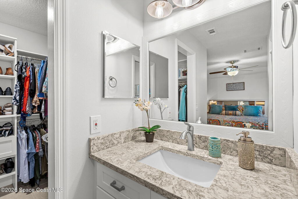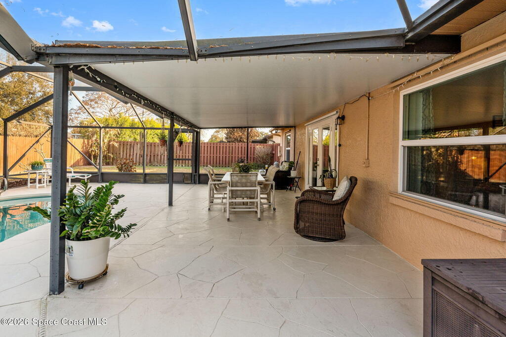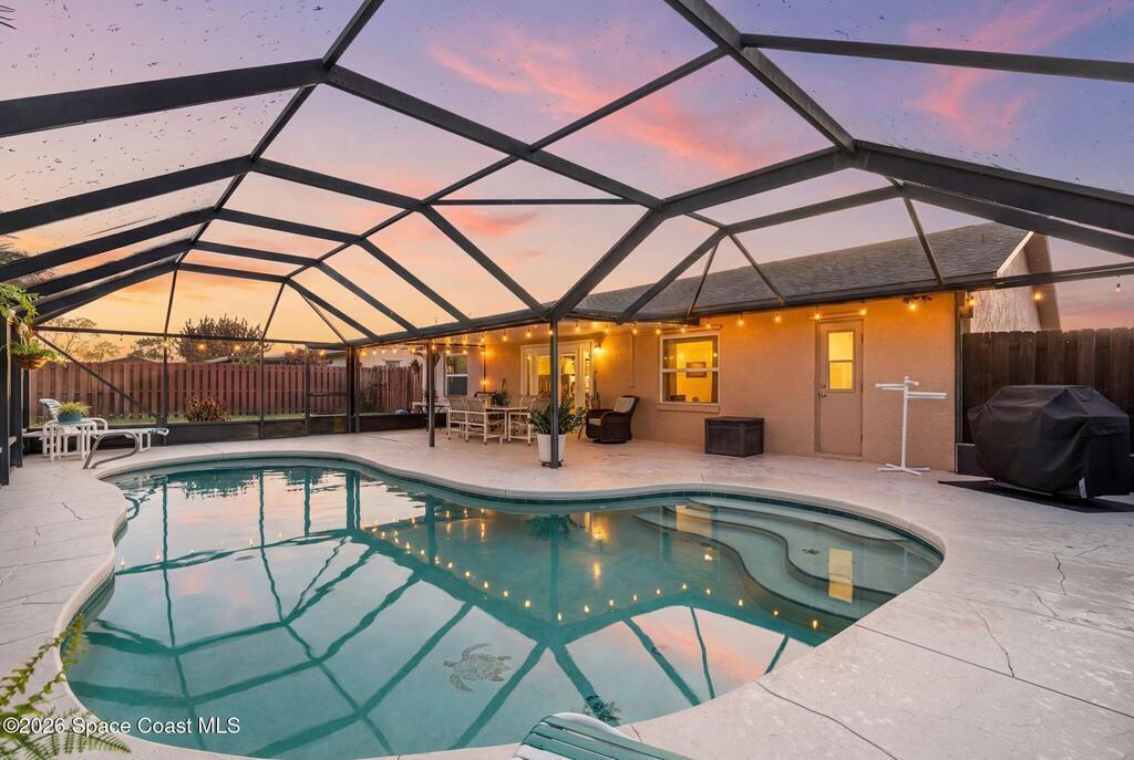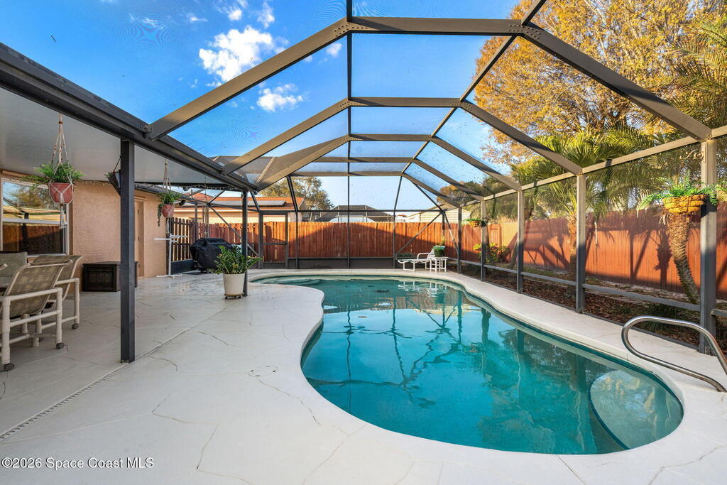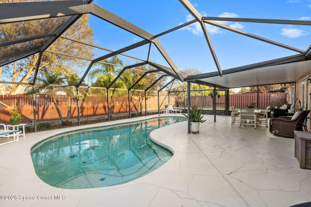 Proudly offered by the original owner, this well-maintained home is located in a highly desirable neighborhood and showcases years of thoughtful updates. Major improvements include a newer roof (2018), impact-rated garage door (2020), updated windows and French doors (2016), and a gas water heater (2019). Inside, you'll find laminate flooring throughout, vaulted ceilings, newer ceiling fans, and updated interior doors with a custom closet system. The kitchen features thoughtfully designed cabinetry with soft-close drawers, pull-out pantry shelving, quartz countertops, and a modern glass backsplash. Bathrooms have been recently updated with a clean, contemporary feel. Enjoy outdoor living with a screened enclosure featuring a fiberglass roof and maintained pool. Gas is available for the kitchen, and the A/C has been recently checked for added peace of mind.