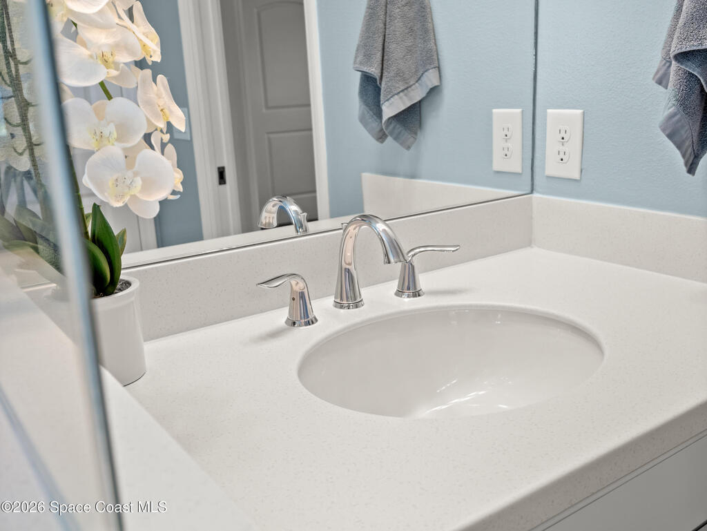 Just listed in Sendero Cove, this like-new home shows like a model and offers the best of Viera living. Featuring four bedrooms, three bathrooms, and a two-car garage, the home welcomes you with gorgeous wood-grain tile flooring throughout the main living areas and luxury vinyl plank flooring in all bedrooms. The stunning designer kitchen includes solid wood cabinets, quartz countertops, a large breakfast bar, and a pantry enhanced with custom storage shelving. The spacious living room and separate dining area create an ideal layout for both everyday comfort and entertaining. The large primary suite is a true retreat, offering an updated walk-in shower with modern tile, dual vanities, a private water closet, and a huge custom walk-in closet. The split floor plan provides excellent privacy, and one of the secondary bedrooms features ensuite access--perfect for guests or multigenerational living. This home is loaded with thoughtful upgrades: