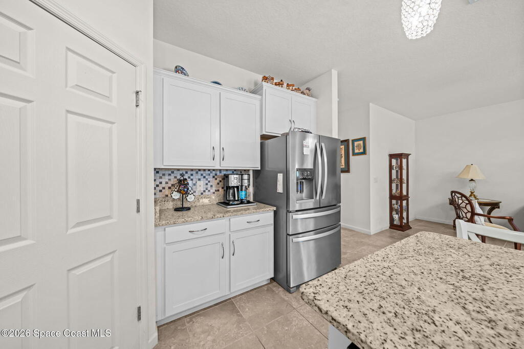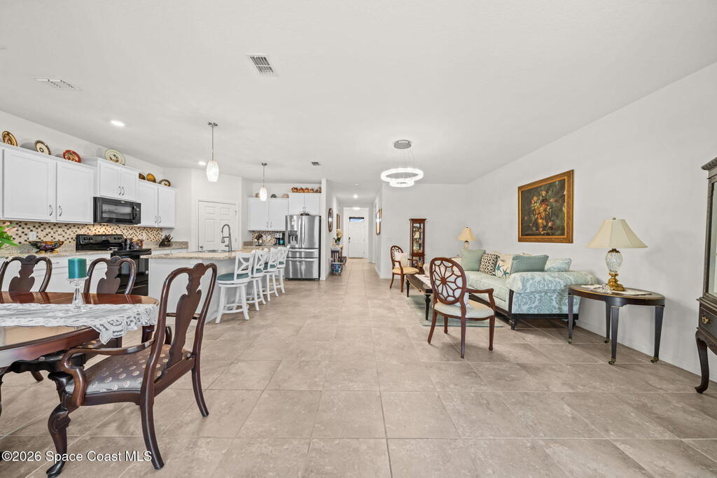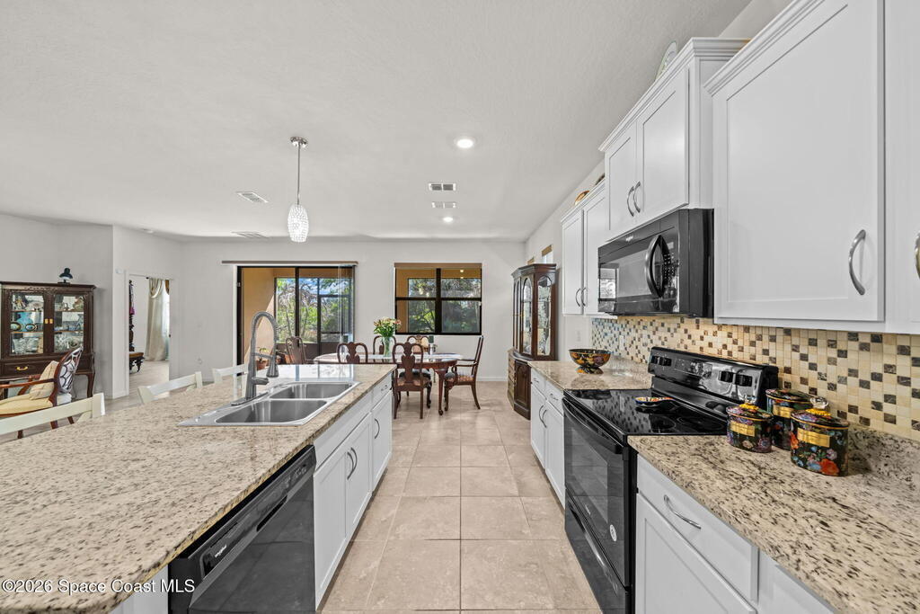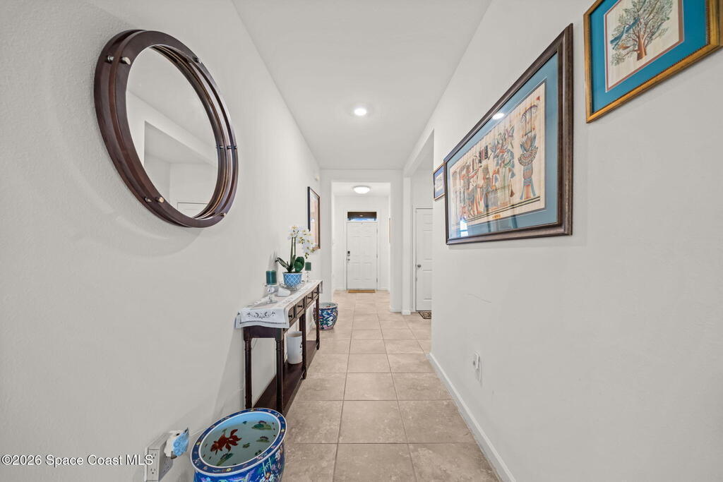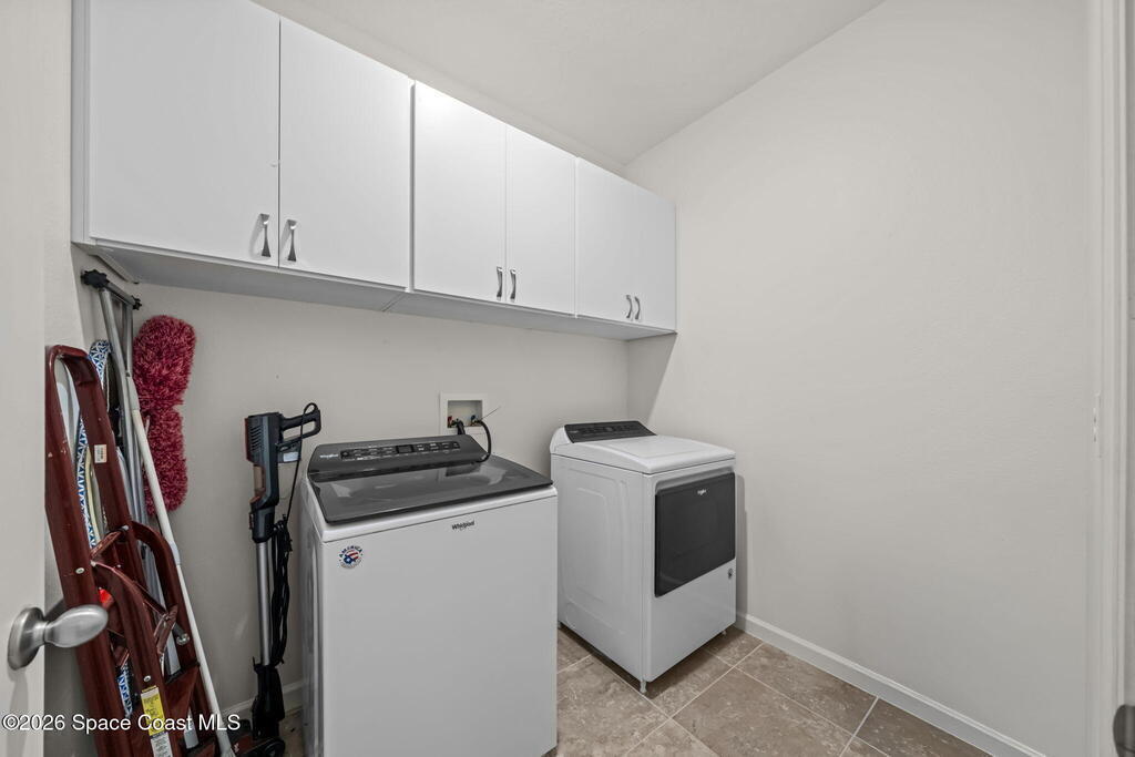 Beautifully upgraded Delray model offering 4 bedrooms (or 3 + flex room), 2 baths, and over 2,034 sq. ft. of open living space. This home features no carpet, with serene light grey tile throughout main areas. The bright kitchen showcases white cabinetry, Crema Pearl granite countertops, and a full stainless steel appliance package, including a new refrigerator.Upgrades include accordion hurricane shutters, custom window treatments, upgraded lighting, and custom laundry room cabinets with washer and dryer included. The spacious primary suite offers dual walk-in closets, while additional features include comfort-height toilets and energy-efficient bronze windows.Enjoy outdoor living on the 9x23 tiled covered lanai. Located in a community with pool and cabana, plus access to Bayside Lakes amenities. Move-in ready!