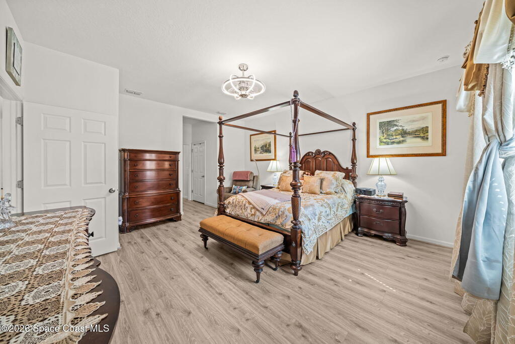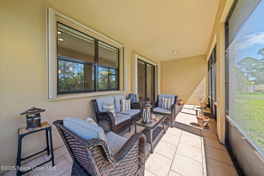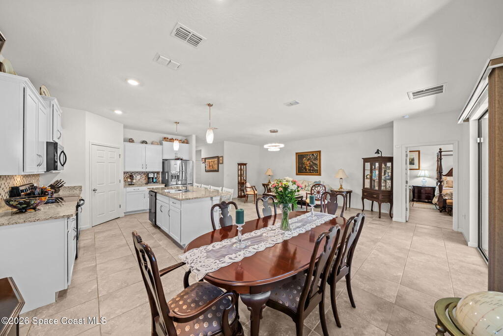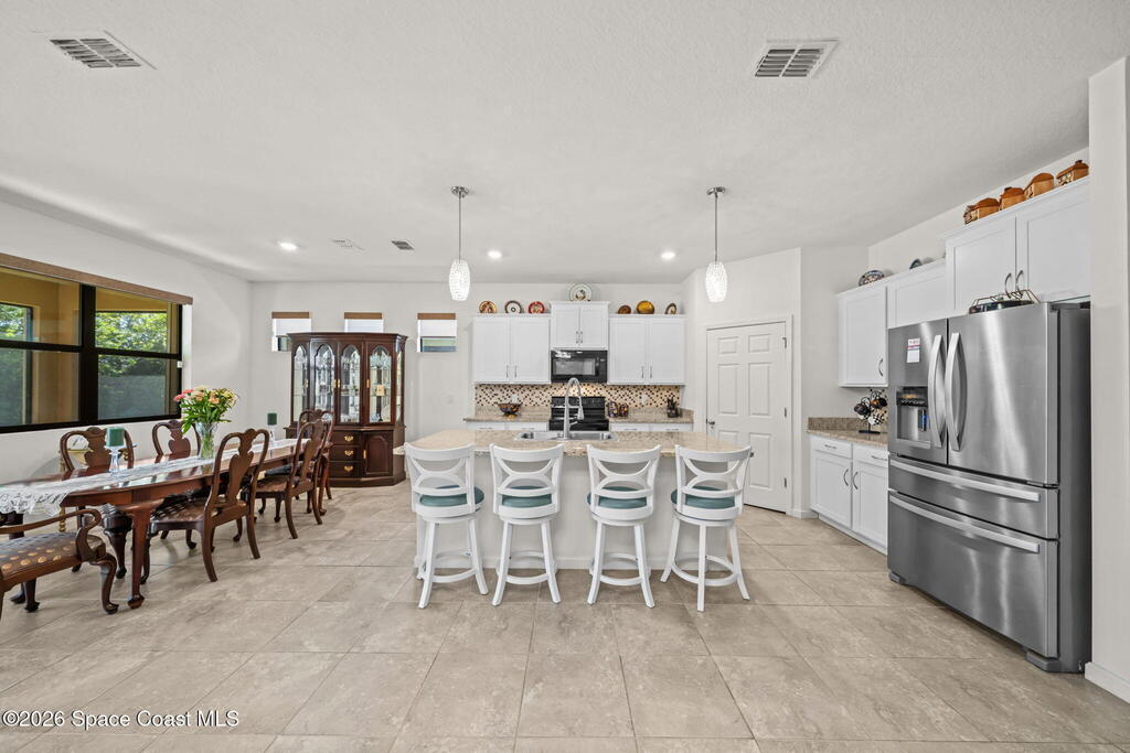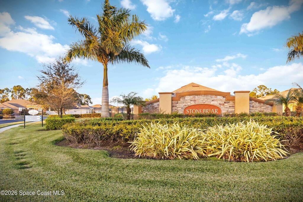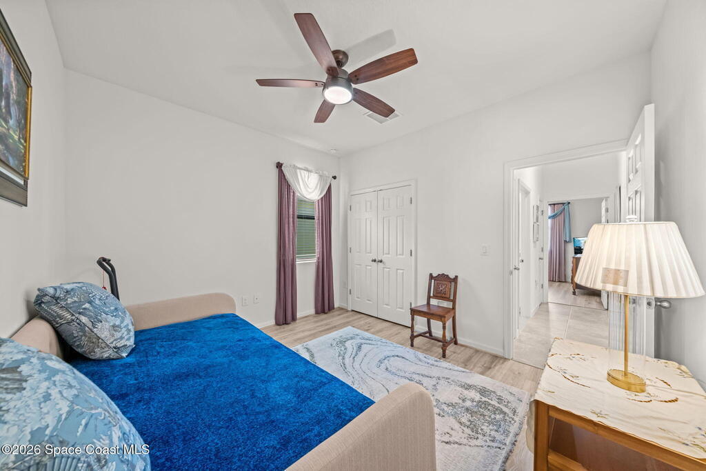 Beautifully upgraded Delray model offering 4 bedrooms (or 3 + flex room), 2 baths, and over 2,034 sq. ft. of open living space. This home features no carpet, with serene light grey tile throughout main areas. The bright kitchen showcases white cabinetry, Crema Pearl granite countertops, and a full stainless steel appliance package, including a new refrigerator.Upgrades include accordion hurricane shutters, custom window treatments, upgraded lighting, and custom laundry room cabinets with washer and dryer included. The spacious primary suite offers dual walk-in closets, while additional features include comfort-height toilets and energy-efficient bronze windows.Enjoy outdoor living on the 9x23 tiled covered lanai. Located in a community with pool and cabana, plus access to Bayside Lakes amenities. Move-in ready!