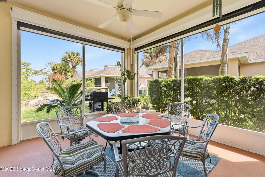 Welcome to easy Florida living in the gated community of Capron Ridge in Viera. This well-maintained one-story end unit townhome backs to beautiful preserve sanctuary, offering privacy & peaceful views. Enjoy the large covered, screened lanai--perfect for relaxing or entertaining. Home features 3BD + flexible bonus room ideal for an ofc/den, along w/ 2BA & 2car garage. Open layout includes upgraded plank laminate flooring in the main living areas, carpet in BD. (2022), Plantation Shutters & large great room design. Kitchen is updated w/ stainless steel appliances (2024), 42-inch cabinets, Corian counters & kitchen island. Washer & dryer (2023) included for added convenience. Community offers resort-style amenities including a gated entrance, pool, clubhouse, fitness center, tennis, pickle ball & basketball courts, walking trails, & fishing piers throughout. Enjoy maintenance-free living in a serene, nature-filled setting. Only 15 min. to beaches, 5 shopping & dining & 40 to Orlando.
