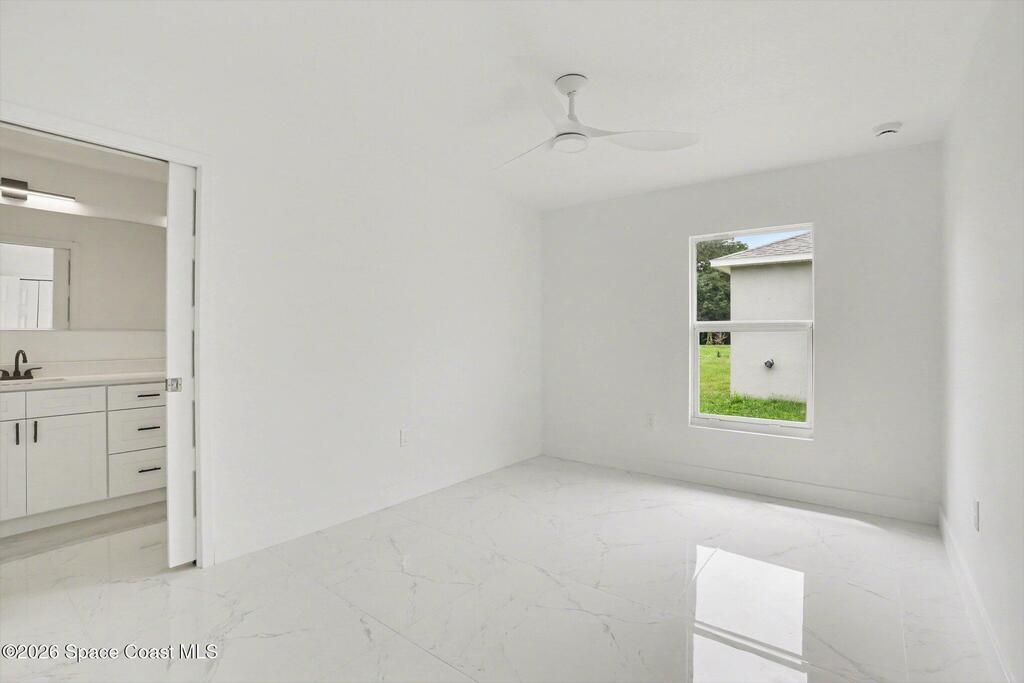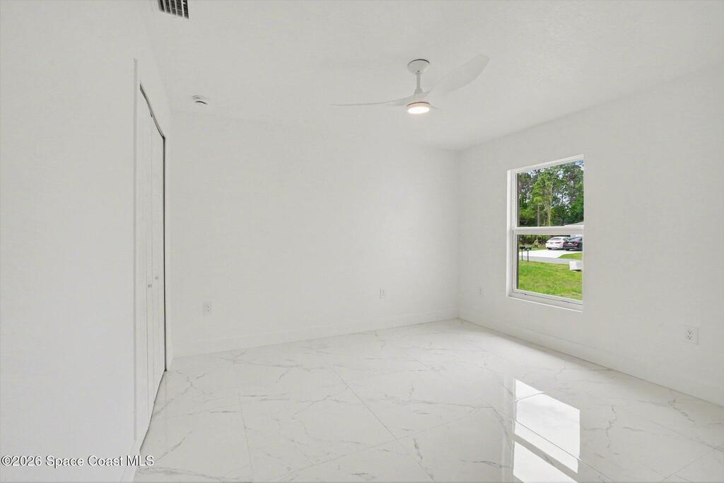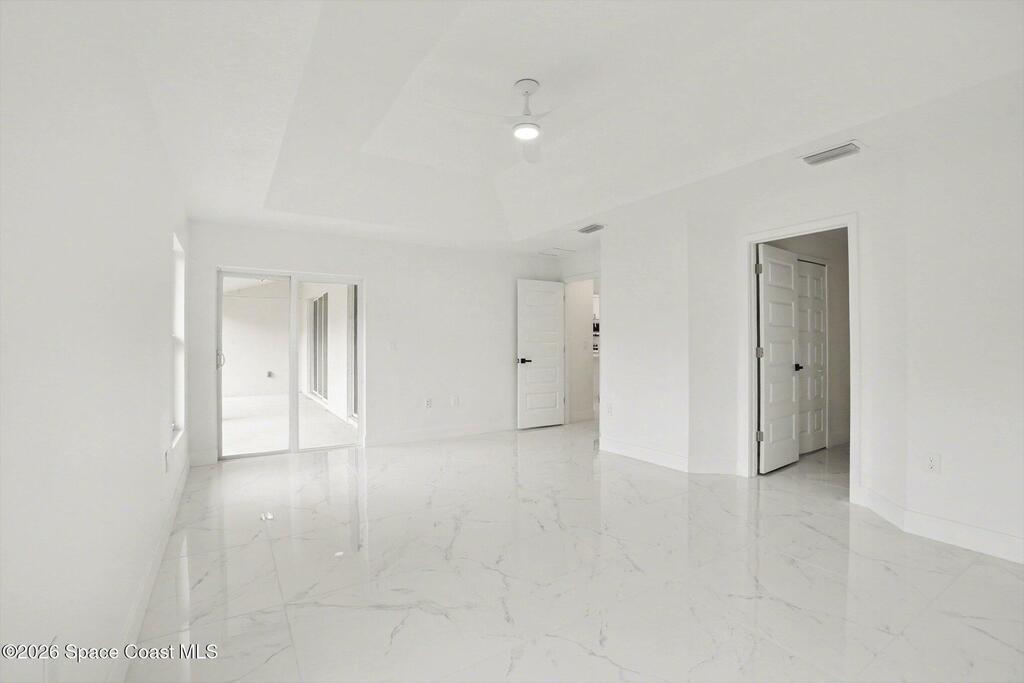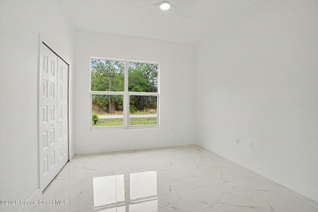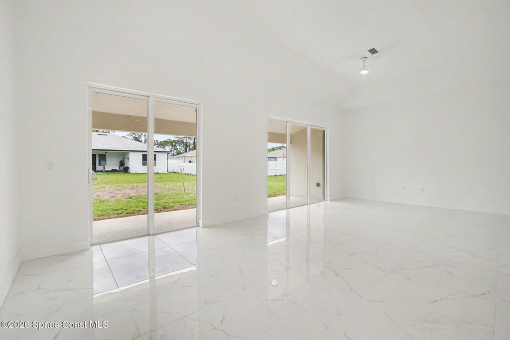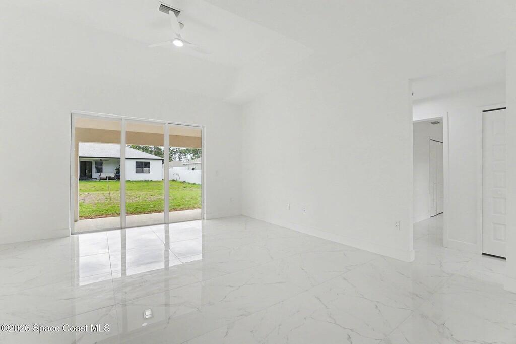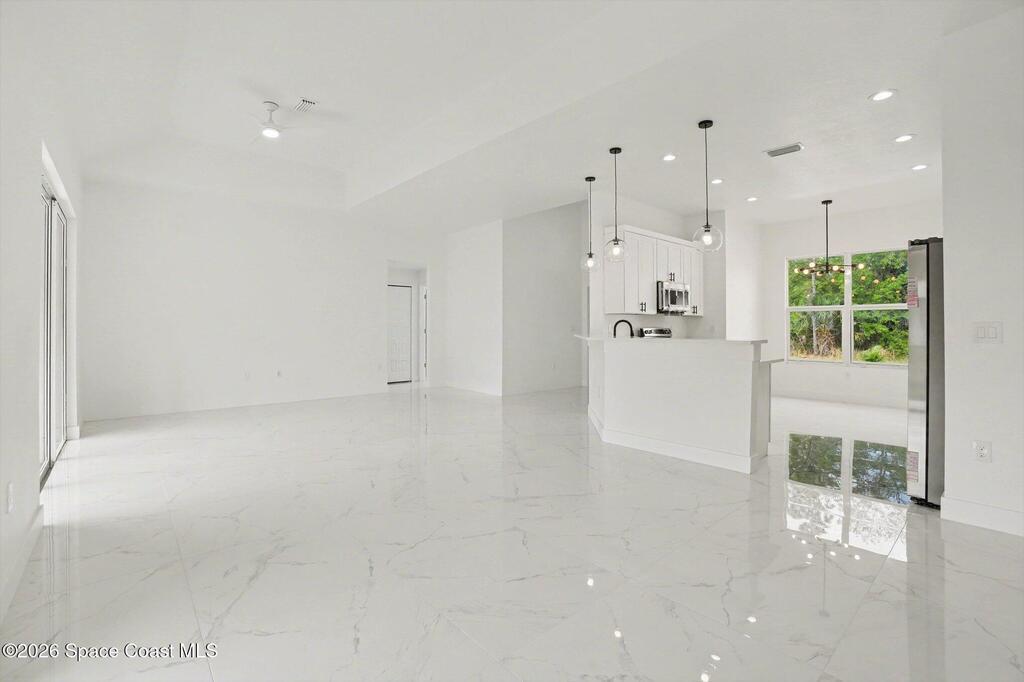 This beautifully designed 4 bed 2 bath concrete block home features elegant tile throughout its 2,052 square feet of living space. The modern kitchen includes stainless steel appliances, granite countertops, small breakfast nook, bar, and pendant lighting, perfect for cooking and entertaining. With four bedrooms and two baths, there's plenty of room for family and guests. This home has a split plan with a connecting bathroom for one bedroom that can be used when company is in town. The primary suite has 2 large walk-in closets, double vanity, tile shower, and separate tub and toilet, a large patio accessible through sliding glass doors, along with the living and dining areas also having double sliders, bringing in lots of natural light. All windows are impact resistant for added security. This home is a must-see for anyone looking for comfort and style!