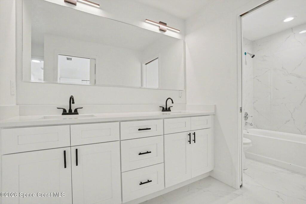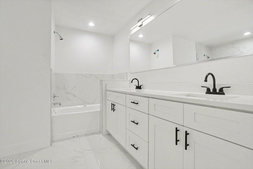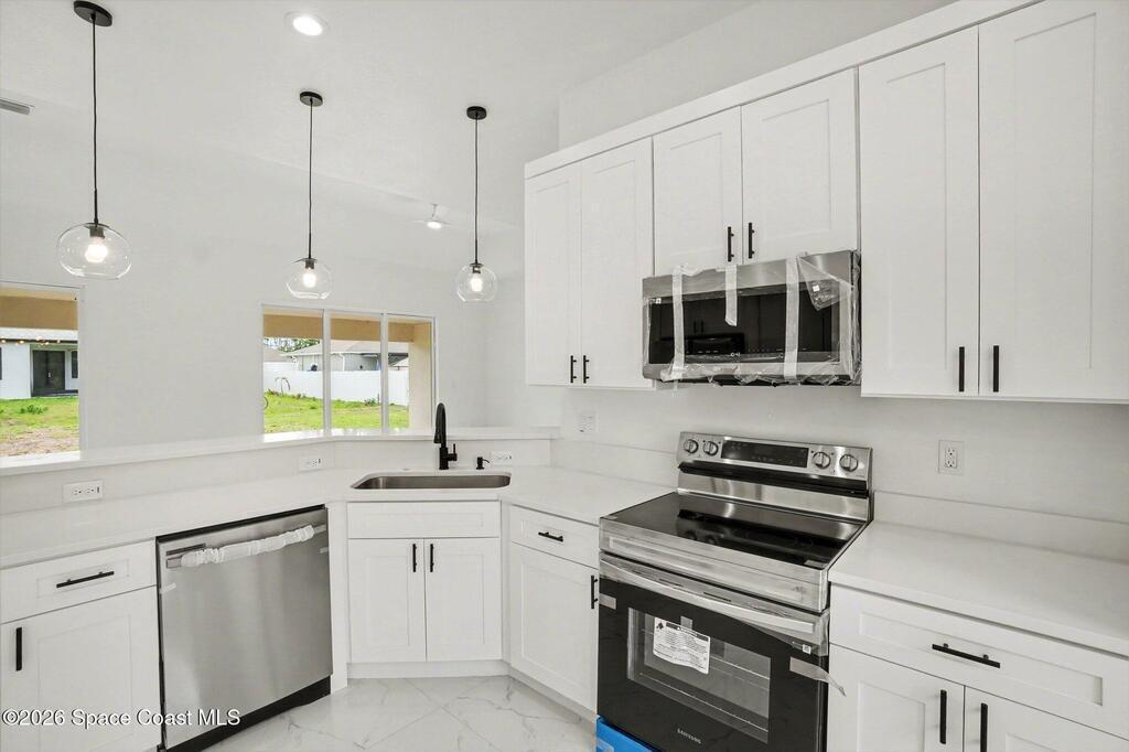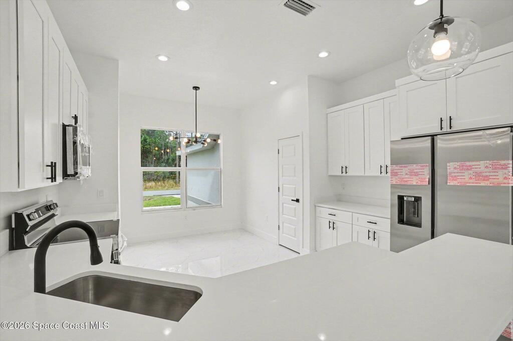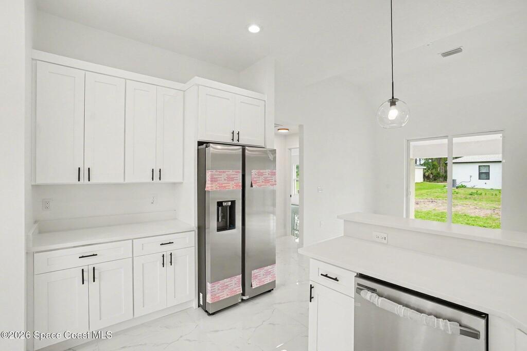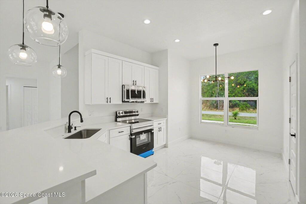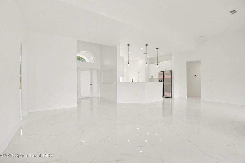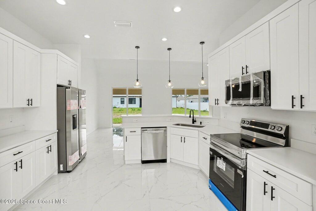 This beautifully designed 4 bed 2 bath concrete block home features elegant tile throughout its 2,052 square feet of living space. The modern kitchen includes stainless steel appliances, granite countertops, small breakfast nook, bar, and pendant lighting, perfect for cooking and entertaining. With four bedrooms and two baths, there's plenty of room for family and guests. This home has a split plan with a connecting bathroom for one bedroom that can be used when company is in town. The primary suite has 2 large walk-in closets, double vanity, tile shower, and separate tub and toilet, a large patio accessible through sliding glass doors, along with the living and dining areas also having double sliders, bringing in lots of natural light. All windows are impact resistant for added security. This home is a must-see for anyone looking for comfort and style!