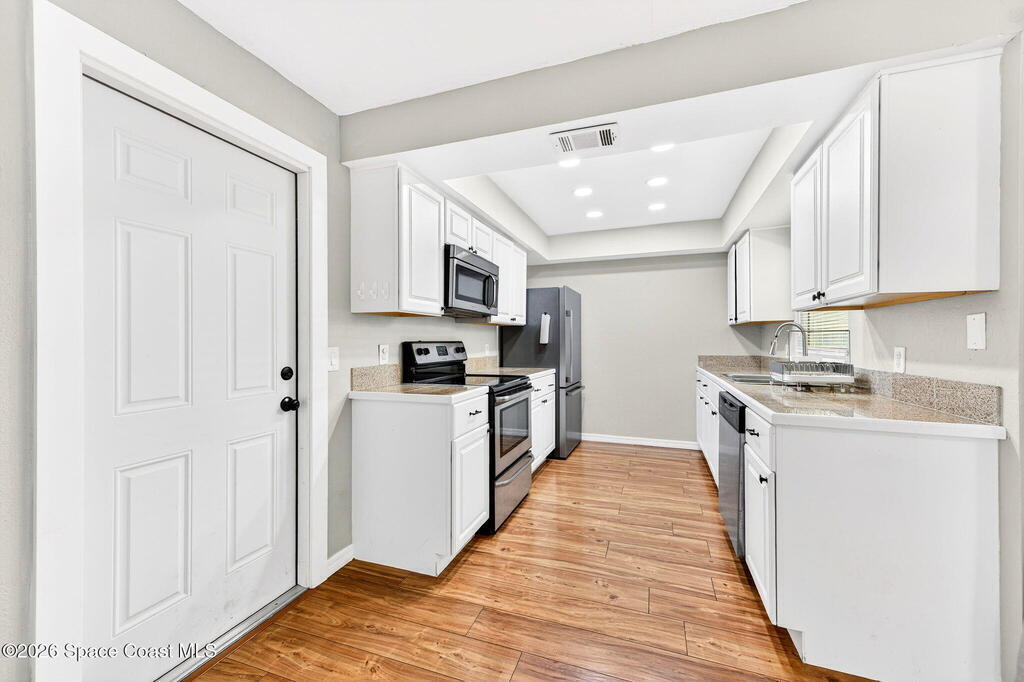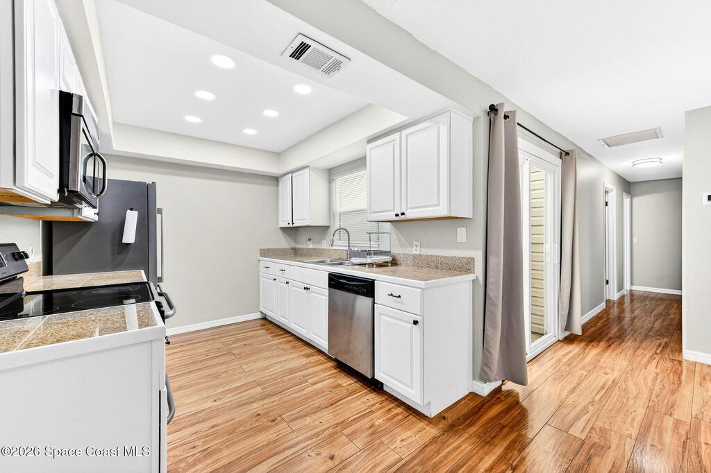 Beautifully updated 3-bedroom, 2-bath home with attached garage on a quiet cul-de-sac. Perfectly located near Wickham Park and close to shopping, dining and entertainment. The light-filled open floor plan features recessed lighting, stainless steel appliances, modern bathroom fixtures, impact sliding glass doors and window, with hurricane shutters for all other openings. A centrally located atrium brings radiant sunshine into the heart of the home, complemented by skylights and ceiling fans throughout. The primary ensuite and second bedroom were uniquely redesigned with the addition of private sitting areas with French doors--ideal for a home office, study, or reading nook. The floor-to-ceiling door walls frame pleasant garden views and flood the rooms with natural light. The home is a blend of easy living in a peaceful setting conveniently close to US1 and Wickham Road.