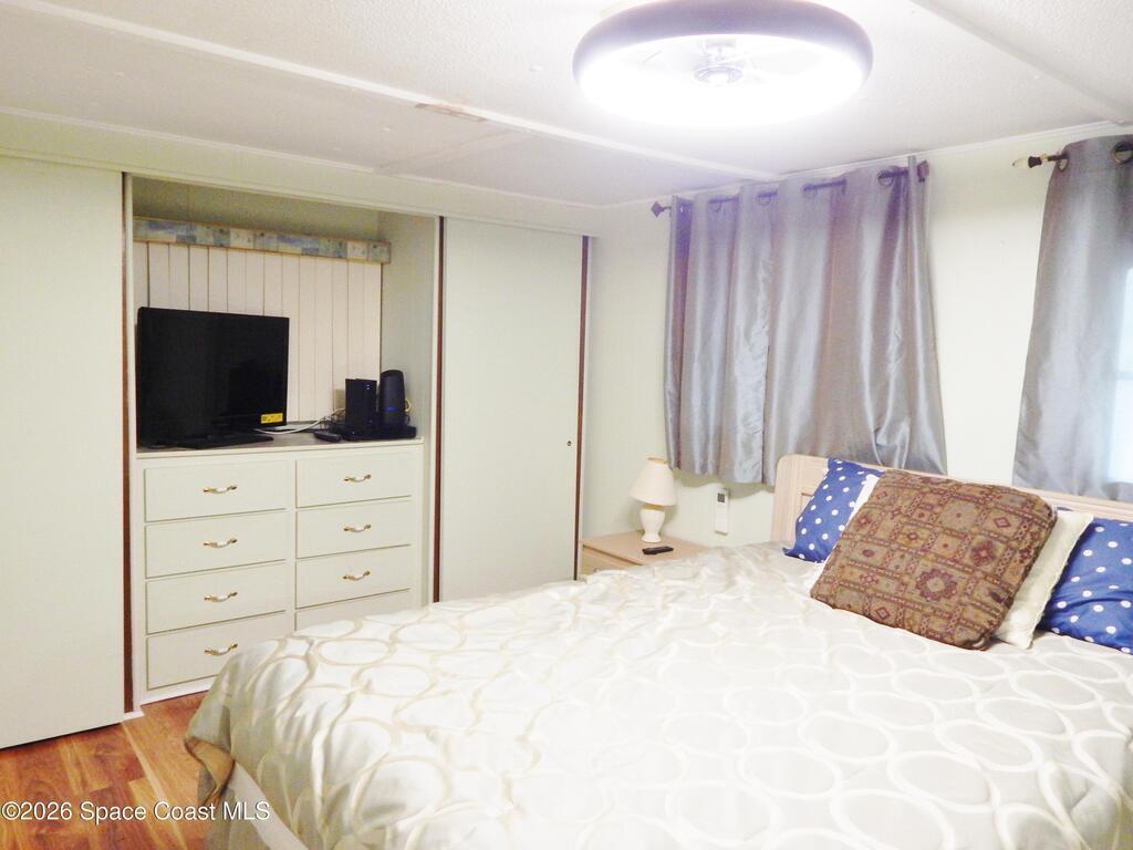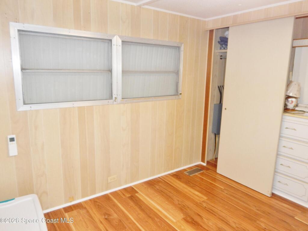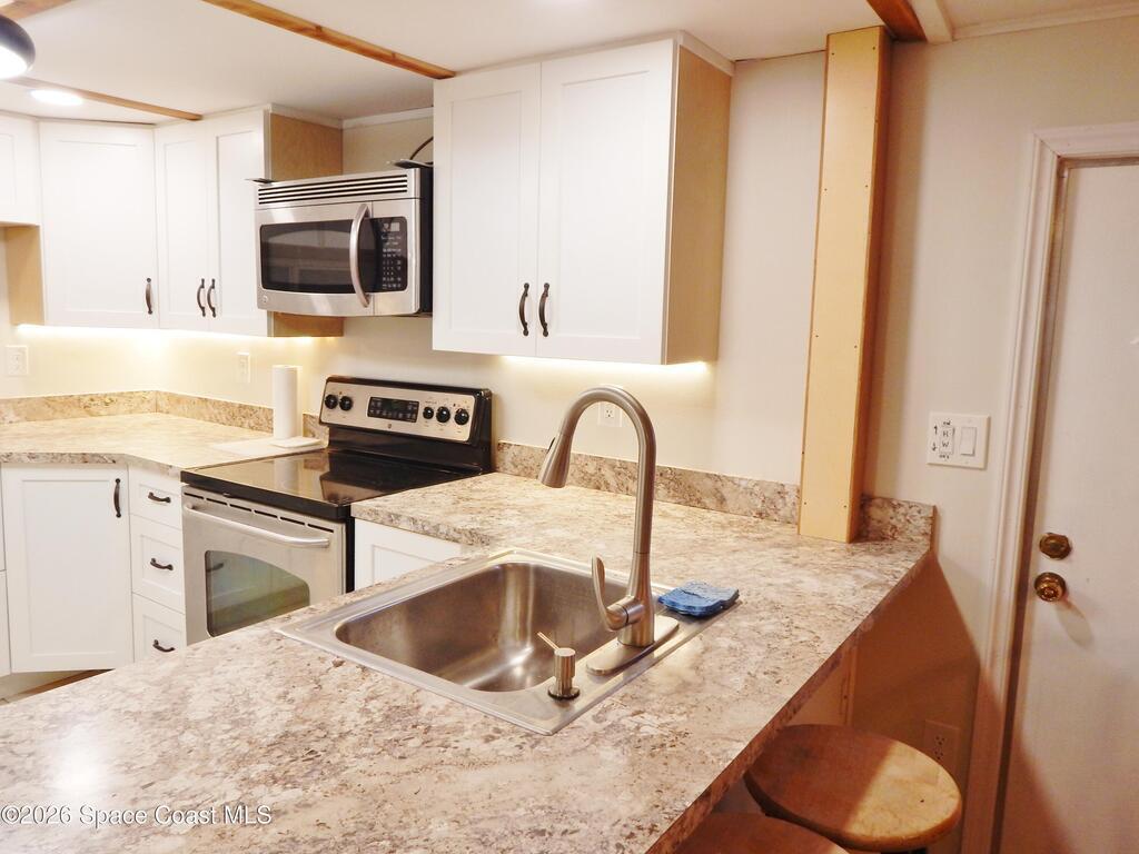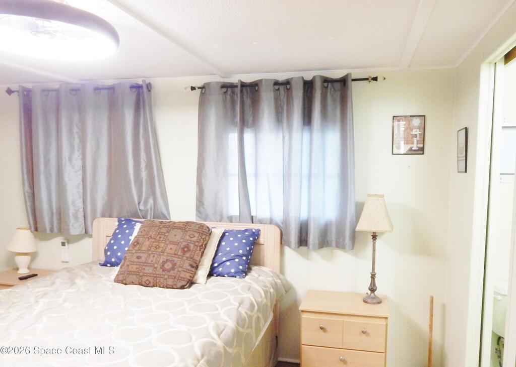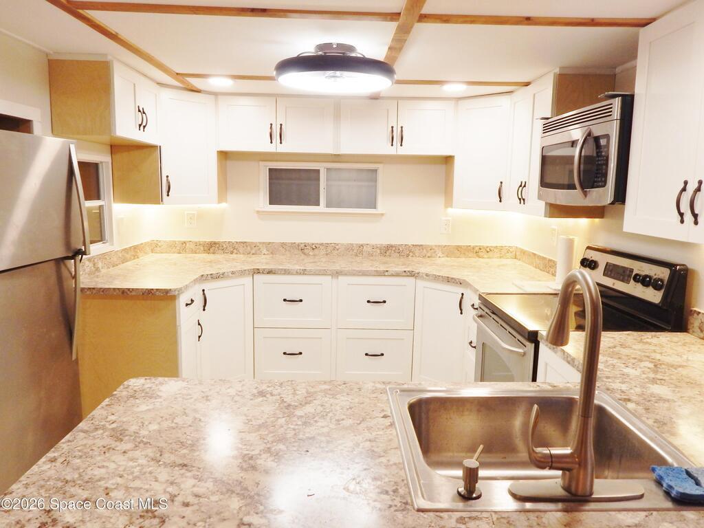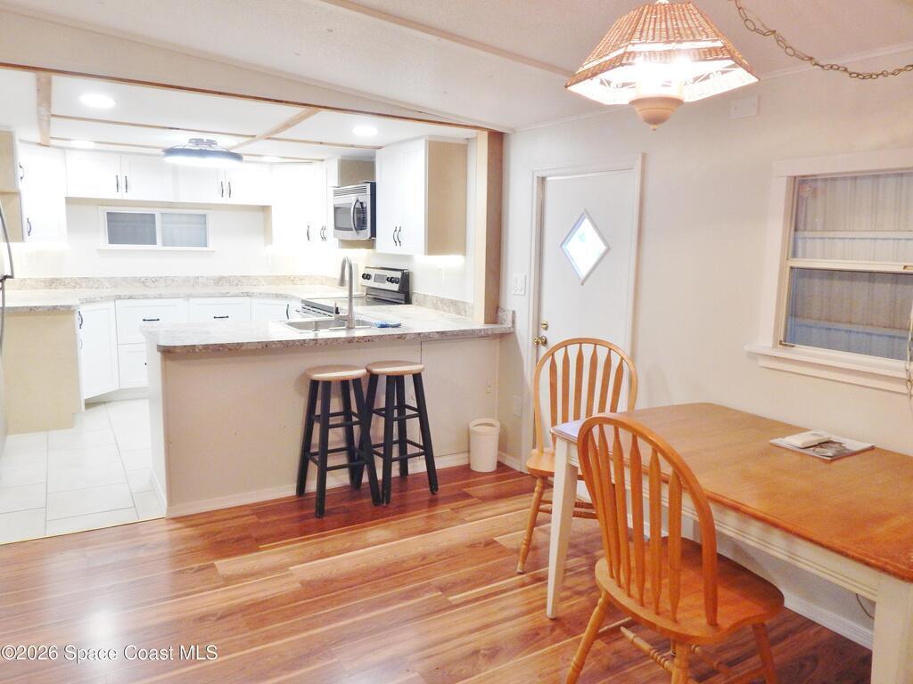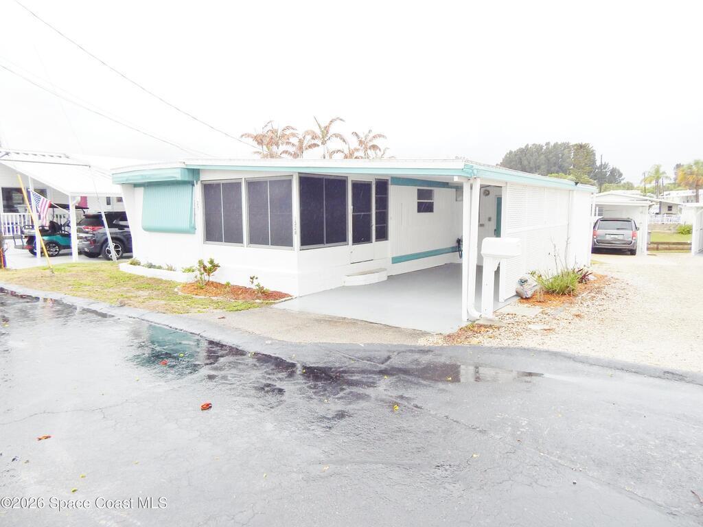 Move-in ready, spacious 2-bedroom, 1.5-bath home in Palm Bay Estates, a 55+ Waterfront Community. This double-wide manufactured home features a new kitchen with stainless steel appliances, an updated main bathroom with a walk-in shower, a new electrical box and service, and wood flooring throughout. The split A/C system was installed in 2022, along with a new roof. Under-counter kitchen lighting, fresh paint, ceiling fans, and new windows in key rooms give the home a modern look.Enjoy the community pool or activities in the clubhouse, which also features a full kitchen. Take a walk or drive your golf cart over to the water and have a picnic. Fish or relax, and enjoy the views of the Indian River. The HOA dues include lawn, landscaping, basic cable, internet, picnic area, pool, clubhouse, community boat dock, and boat ramp. Boat storage and RV parking are available for a fee, depending on availability. Make Palm Bay Estates your new home.