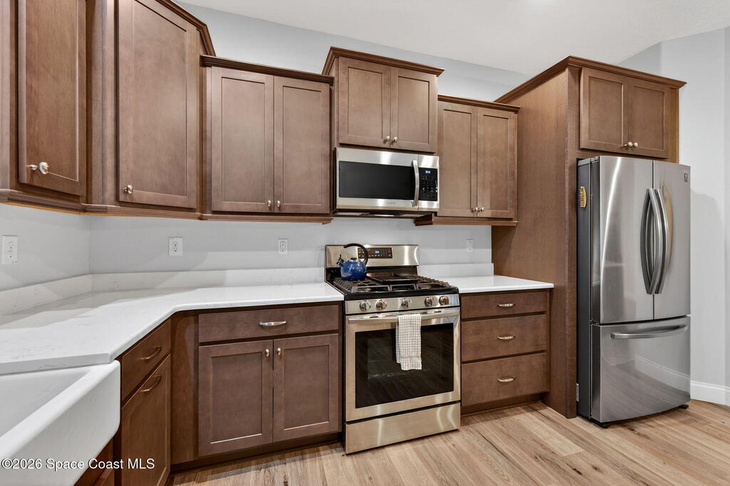 ''Only the Best'' in this beautifully upgraded 3BR/2BA home in sought after Capron Ridge. Built in 2020 yet better than new, this Key West inspired residence features a front porch, partial metal roof, 2 car garage, and impact windows and doors. Enter through an elegant 8ft door into a foyer with tray ceiling and decorative millwork. The open layout offers luxury vinyl plank flooring, while the gourmet kitchen includes a gas range, stainless appliances, updated soft-close cabinetry, and quartz countertops. Enjoy your private outdoor retreat with an electric heated pool, waterfall, SunPro awning, and lush landscaping. Over $111K in upgrades include a whole-house generator, hurricane screens with additional Kevlar patio protection, plantation shutters, new 2026 carpet, and added metal shutters. Gated community with 24-hour security, lawn care, resort-style amenities, and transferable structural warranty. Viera Schools, close to I95 and minutes from Medical, shopping and beaches.
