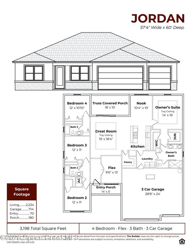 $10,000 FLEX CASH WITH APPROVED LENDER!! Welcome to the Jordan Model, offering over 2,230 square feet of thoughtfully designed living space. This spacious home features 4 bedrooms, a versatile flex space, and 3 full bathrooms, along with a 3-car garage for added convenience.Inside, you'll find elegant 8-foot interior doors, beautiful quartz countertops, and an open layout perfect for both everyday living and entertaining. Enjoy outdoor living year round with trussed porches designed for comfort and durability. This home is serviced by city water and septic.