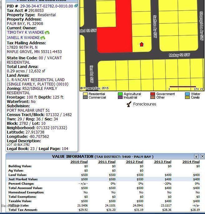 Over-sized 0.29 acre CORNER Residential (RS2) lot available in Port Malabar Unit #51 of SW Palm Bay. The lot is adjacent to a 3.11 acre tract owned by the City of Palm Bay and will be close to the Palm Bay Parkway opening soon. The City of Palm Bay does not have any plans of placing utilities in this unit; so the lot and the area is not buildable. From Exit #176 of I-95 go west on Palm Bay Road NE. Turn left on Minton Road and proceed south for 3.3 miles. Turn right on Jupiter Boulevard SW and left on De Groodt Road SW. Proceed south for 2.5 miles and turn right on J.A. Bombardier Boulevard. Proceed west for 2.0 miels and turn left on Wighham Drive SW. Proceed 1.9 miles and turn left on St. Andre Boulevard, Right on Ilex Road SW, and left onto Makow Street SW to the corner.. see remarks...