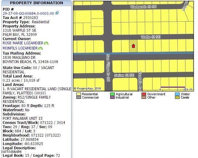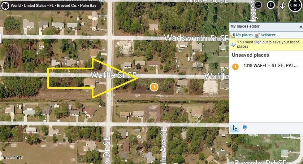 1 of 2 side-by-side adjacent 0.23 acre residential lots (Rs2 Zoning) with a right-of-way easement in the back for more privacy available in Port Malabar Unit #15. Conveniently located in the SE Section of Palm Bay near the PGA Majors Golf Course, this property is about 6 minutes to Publix Shopping, 10 minutes to Bayside High School, and less than a 1/2 hour to the Melbourne International Airport and the beaches in Indialantic. Homes already present in the area and ready for a first time home buyer, builder or investor. From Exit #173 of I-95 go west on Malabar Road NE, turn left on San Filiipo Drive SE and proceed south for 2.0 miles. Turn right onto Waffle Street SE. The destination will be on your left.