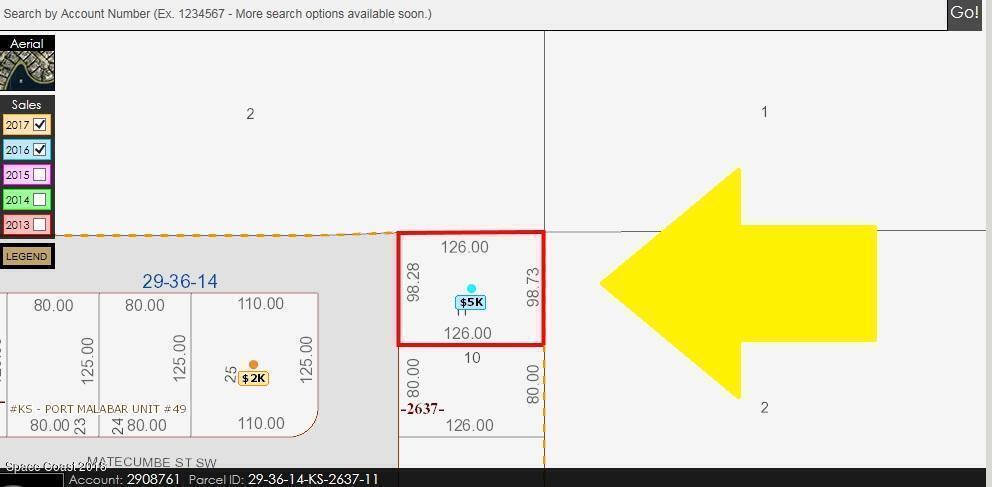Over-Sized 0.29 acre single family residential build-able CORNER lot (Rs2 Zoning) available in Port Malabar Unit #49. Nicely located in the SW Section next to Bayside Lakes subdivision, this lot is just 1.6 miles -6 minutes- to Bayside High and Westside Elementary Schools, 2.9 miles -9 minutes- to Publix Shopping, 7.2 miles -18 minutes- to the Shoppes of Palm Bay, 14.5 miles -38 minutes- to the Melbourne International Airport, and just 17.5 miles -41 minutes- to the beaches in Indialantic. From Exit #176 of I-95 go west on Palm Bay Road NE. Turn left on Minton Road and proceed south for 3.3 miles. Turn right on Jupiter Boulevard SW and left on DeGroodt Road SW. Proceed south for 2.5 miles and turn right on J.A. Bombardier Boulevard. Proceed for 0.9 miles and turn right on Madden Avenue.