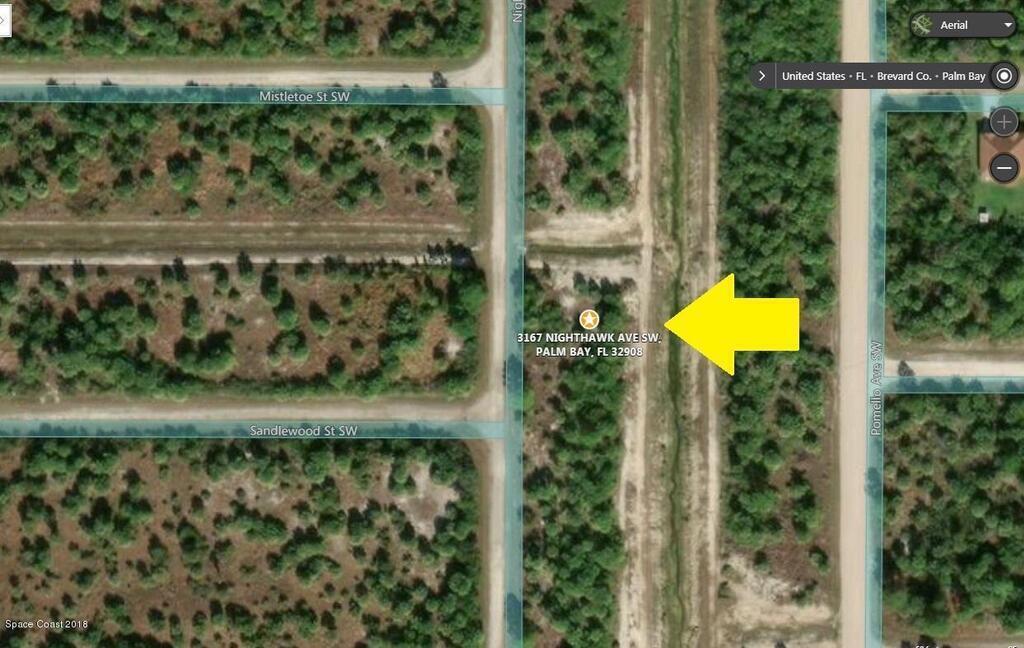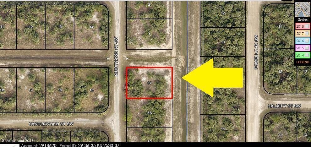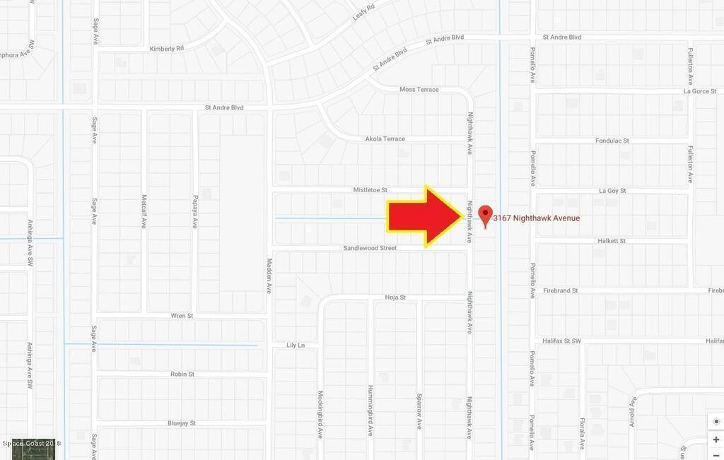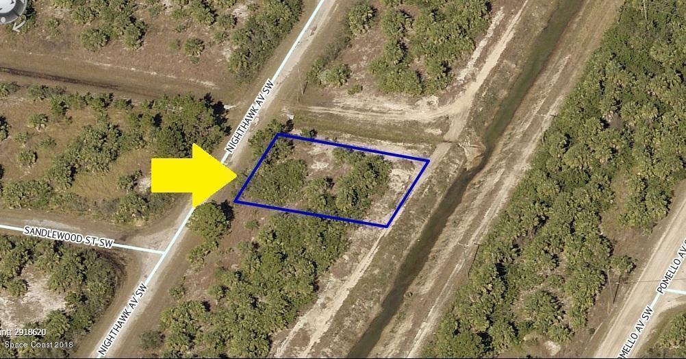 0.24 acre corner lot with a drainage right-of-way easement canal in the back of the property available in Port Malabar Unit #49 of SW Palm Bay. Nicely located in the SW Section of the build-able area, this lot is just 3.4 miles -6 minutes- to Bayside High and WestSide Elementary Schools, 4.9 miles -9 minutes- to Publix Shopping, 9 miles -17 minutes- to the Shoppes of Palm Bay, and just 18.3 miles -38 minutes to the beaches of Indialantic. From Exit #173 of I-95 go west on Malabar Road NE. Turn left on San Filippo Drive SE and proceed south for 7.2 miles. Continue on Degroodt Road SW and turn left on St. Andre Boulevard. Proceed south for 1.1 miles and turn left on Moss Terrace which becomes Nighthawk Avenue. the lot will be on your left hand side.