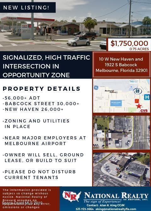 SIGNALIZED, HIGH TRAFFIC INTERSECTION IN OPPORTUNITY ZONE. Property for sale includes 10 West New Haven Avenue (Tax Account: 2818600), 1922 South Babcock Street (Tax Account: 2818599) and vacated alleyway for a total of .75 acres +/-. Currently improved with a gas station and an office/retail building. Highest and best use may be to clear and redevelop the site. Landmark corner location. 56,000+ ADT. Babcock Street 30,000+. New Haven 26,000+. Zoning and Utilities in Place. Near major employers at Melbourne Airport. Owner will sell, ground lease, or build to suit.