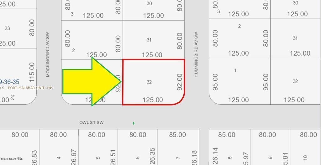 There are electric and telephone lines available at the street !! 0.26 acre buildable Corner residential lot available in Port Malabar Unit #49 of Palm Bay. Located in the southwest section, this lot is just 3.5 miles - 8 minutes to Westside Elementary School, 5.5 miles - 11 minutes to Publix Supermarket, 16.7 miles - 33 minutes to Melbourne International Airport, and 18.5 miles - 34 minutes to the beaches of Indialantic. From exit #173 of I-95 go west on Malabar Road NE for .2 miles, left on San Filippo Drive SE for 7.3 miles, continue on DeGroodt for .2 miles, left on St. Andre Boulevard for 1.2 miles, left on Madden Avenue for .5 miles, and left onto Owl Street The lot will be on the northwest corner of Owl and Hummingbird.