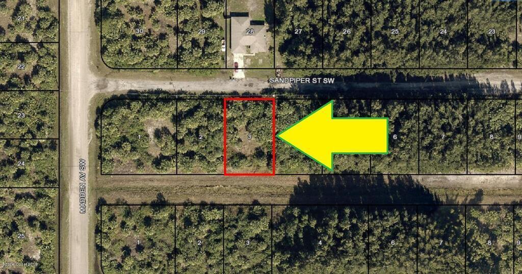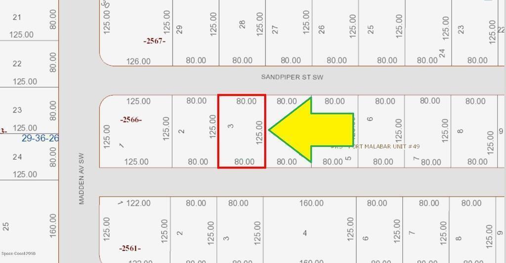 There are electric and telephone powerlines at the street ! 0.23 acre buildable residential lot available in Port Malabar Unit #49 of Palm Bay. Located in the southwest section, this lot has a drainage canal in the rear allowing more privacy, and is just 2.6 miles - 7 minutes to Westside Elementary School, 4.5 miles - 11 minutes to Publix Supermarket, 16.0 miles - 34 minutes to Melbourne International Airport, and 18.5 miles - 34 minutes to the beaches of Indialantic. From exit #176 of I-95 go west on Palm Bay Road NE for .7 miles, left on Minton Road for 3.3 miles, right on Jupiter Boulevard SW for .1 mile, left on DeGroodt Road SW for 3.3 miles, right on Osmosis Drive for 1.0 mile, left on Madden Avenue for 1.1 miles, and left on Sandpiper Street. The lot will be on your right.