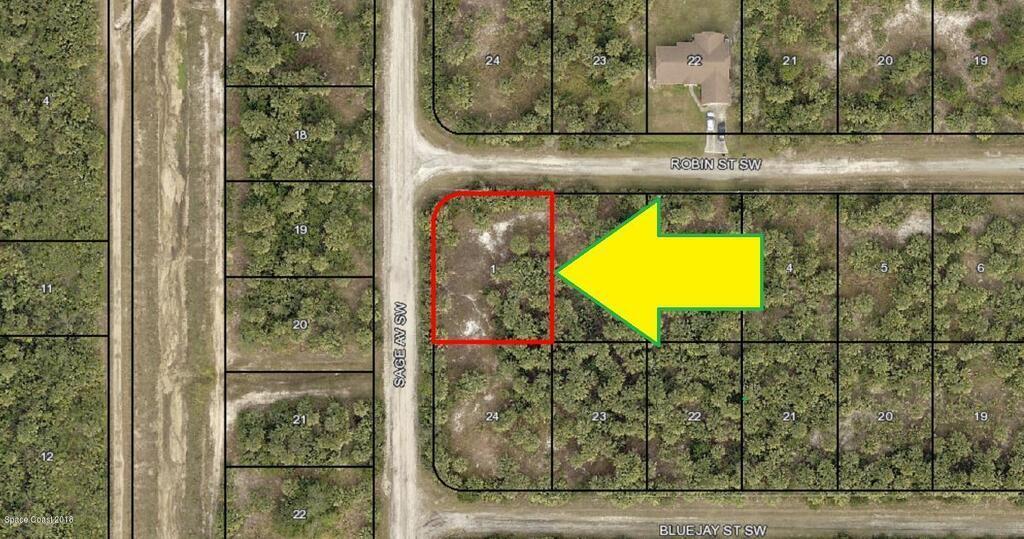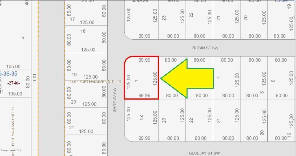 0.29 acre buildable residential Corner lot available in Port Malabar Unit 49 of Palm Bay. Located in the southwest section, this lot is just 3.4 miles - 7 minutes to Westside Elementary School, 5.4 miles - 11 minutes to Publix Supermarket, 16.6 miles - 32 minutes to Melbourne International Airport, and 18.4 miles - 34 minutes to the beaches of Indialantic. From exit #173 of I-95 go west on Malabar Road NE for .2 miles, left on San Filippo Drive SE for 7.3 miles, continue on DeGroodt Road SW for .2 miles, left on St. Andre Boulevard for 1.4 miles, left on Sage Avenue for .3 miles until you get to Robin Street. The lot is on the southeast corner.
