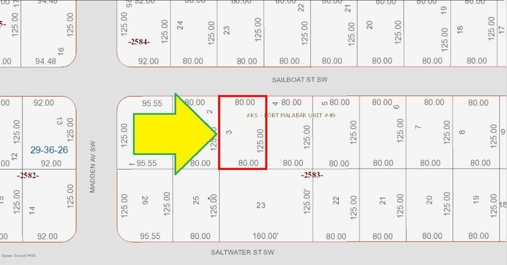0.23 acre buildable residential lot available in Port Malabar Unit 49 of Palm Bay. Located in the southwest section, this lot is just 1.9 miles - 5 minutes to Westside Elementary School, 3.8 miles - 9 minutes to Publix Supermarket, 15.4 miles - 30 minutes to Melbourne International Airport, and 17.9 miles - 33 minutes to the beaches of Indialantic. From exit #176 of I-95 go west on Palm Bay Road NE for .7 miles, left on Minton Road for 3.3 miles, right on Jupiter Boulevard SW for .2 miles, left on DeGroodt Road SW for 2.5 miles, right on Osmosis Drive for 1.0 mile, left on Madden Avenue for .5 miles, and left onto Sailboat Street. The lot will be on your right.