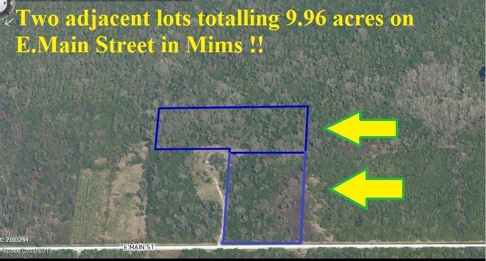 SELLER OPEN TO ALL FINANCING, LEASE,TRADE OPTIONS! --Two Adjacent lots totaling 9.96 acres available with approx. 330' of road frontage on E. Main Street in Mims, North Brevard County. The two properties (located between U.S. #1 and the Indian River which is less than 3000 feet away) are in Flood Zone ''X'; so no flood insurance is required; and Photo #4 shows NO ONLINE EVIDENCE of WETLANDS on either lot. Brevard County advises the front 4.96 acres is zoned AG-Residential. The back half is residential. Located east of US Highway 1, this lot is is just 1.8 miles - 5 minutes to Mims Elementary School, and less than 1 mile from US 1 and shopping. From exit #223 of I-95 go east on W. Main Street for 2.2 miles. The lot will be on the left. This part of Main Street is a gravel road.