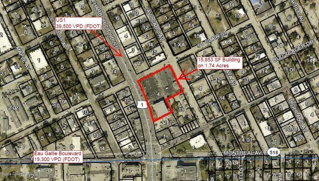 15,853 SF +/- Total; 1st Floor 9,188 SF +/-; 2nd Floor 6,665 SF +/-. Flexible C-3 Zoning allows for a variety of uses including office, financial, research, clubs/lodges, restaurant, houses of worship, medical/dental and many more!!338' +/- FF US1; 268' +/- FF St. Clair; 227' +/- FF Avocado Avenue. City of Melbourne 8'' Water Line in place to add fire sprinklers