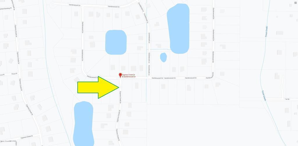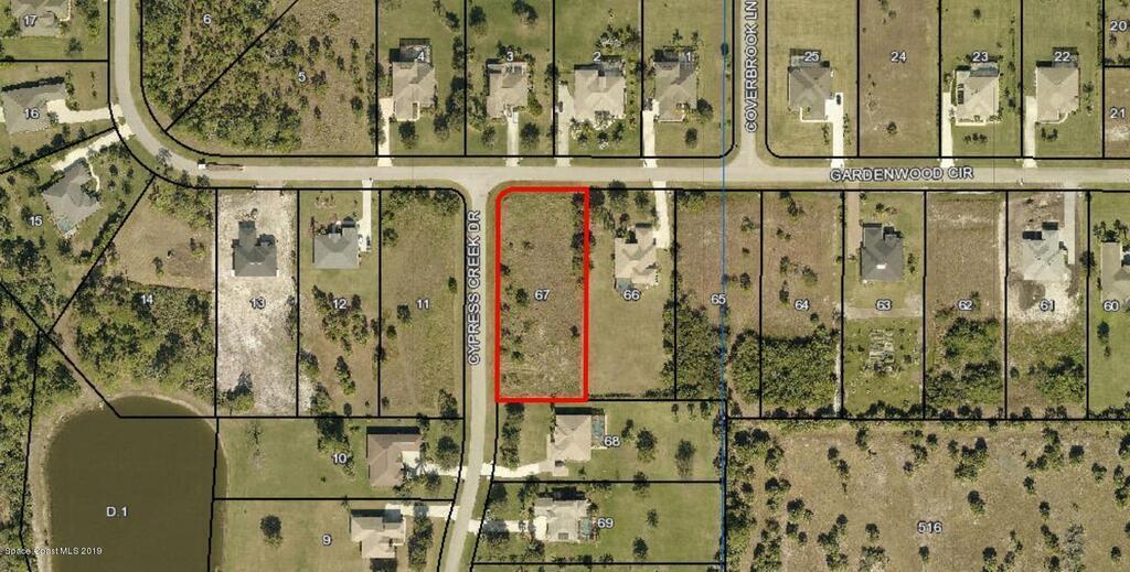 1-acre buildable single family residential Corner lot available in the exclusive highly desirable Cypress Creek Subdivision in Grant-Valkaria. This subdivision features custom built homes with many amenities including a Park area, Tennis Courts, and a water access/fishing pier, is nicely located near the Sebastian Inlet, and just 11 minutes to the Valkaria Airport and 17 minutes to the Bayside Lakes Shopping Center. No online evidence of wetlands and in Flood Zone ''X''. From Exit #173 of I-95 go east on Malabar Road SE for .6 miles, right on Babcock Street for 5.1 miles, left on Grant Road for 4.8 miles, left on Cypress Creek Parkway for 305 feet, right on Cypress Creek Drive for .4 miles to the corner with Gardenwood Circle. The lot will be on your right on the southeast corner.