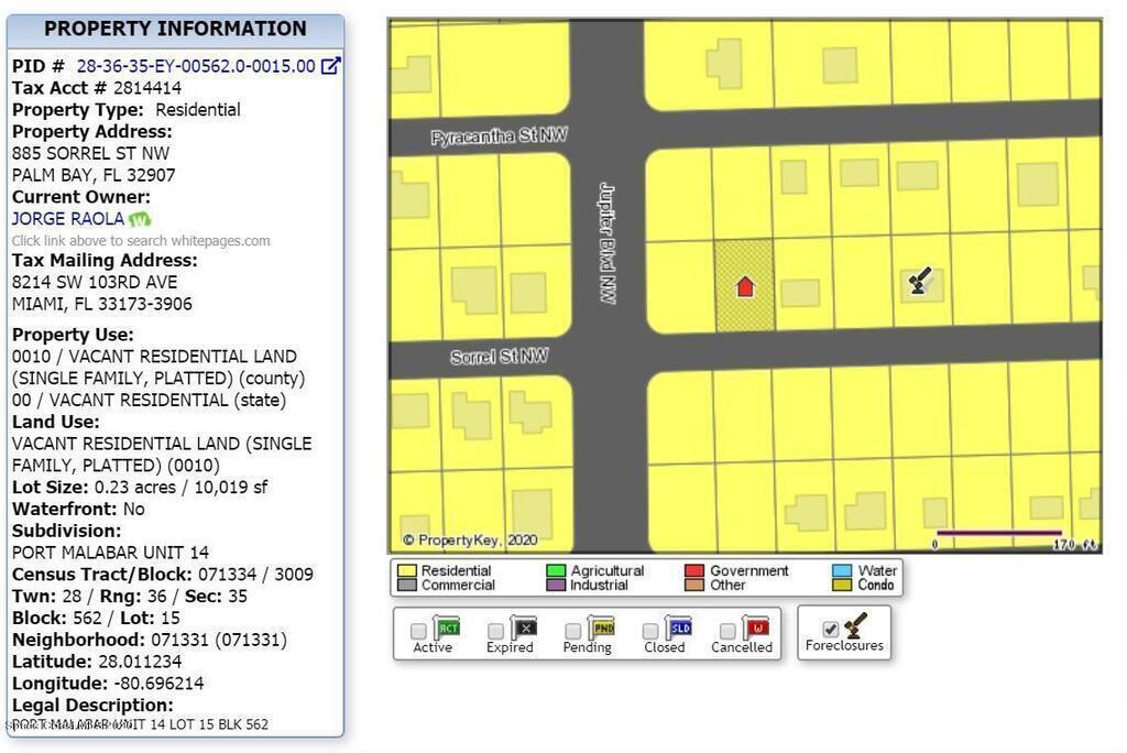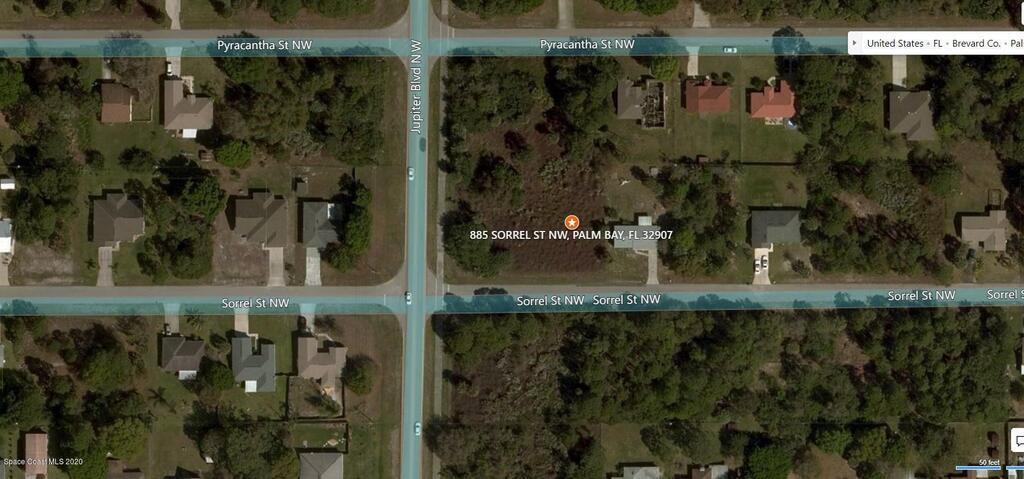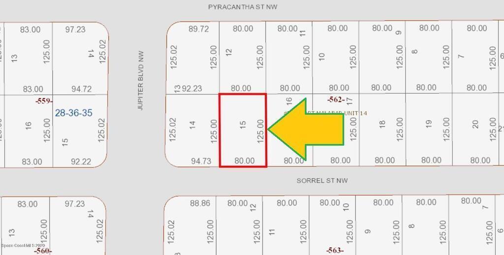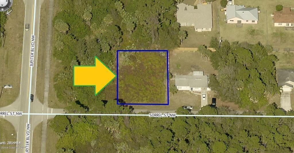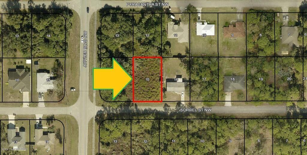 0.23 acre buildable single family residential lot available in Port Malabar Unit #14 of Palm Bay. Located in the Northwest section, this 0.23 acre lot is just 2.3 miles - 6 minutes to the Winn Dixie Supermarket, 2.5 miles - 6 minutes to McAuliffe Elementary School, 10.3 miles - 21 minutes to Melbourne Airport, and 12.9 miles - 26 minutes to the beaches of Indialantic. From exit #176 of I-95 go west on Palm Bay Road NE for .7 miles, left on Minton Road for .2 miles, right on Emerson Drive NW for 1.5 miles, left on Jupiter Boulevard for 1.5 miles, and left on Sorrel Street. The lot will be on your left. .