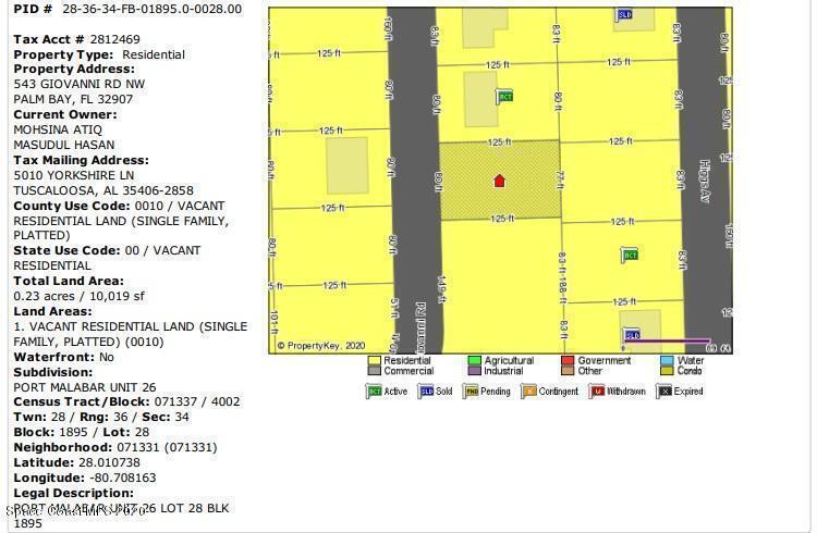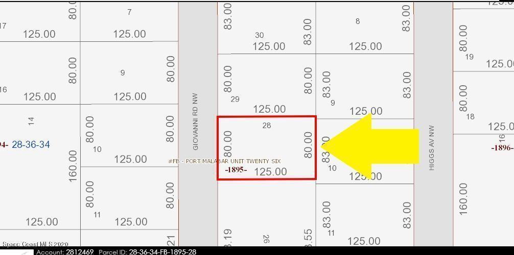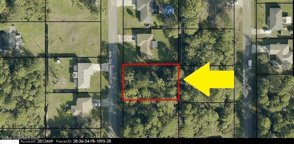 0.23 acre buildable single family residential lot available in Port Malabar Unit #26 of Palm Bay. Located in the northwest section, this lot is just 3.2 miles - 8 minutes to the Winn Dixie Supermarket, 3.4 miles - 8 minutes to McAuliffe Elementary School, 11 miles - 26 minutes to Melbourne Airport, and 13.8 miles - 33 minutes to the beaches of Indialantic. From Exit #176 of I-95 go west on Palm Bay Road NE. Turn left on Minton Road and right on Emerson Drive NW. Proceed west for 1.5 miles and turn left on Jupiter Boulevard NW. Proceed 1.3 miles and turn right on Serenade Street NW. Turn right on Giovanni Road NW and the lot will be on the left.