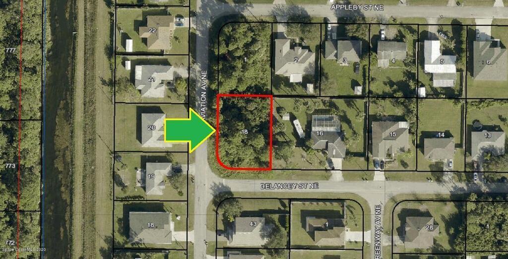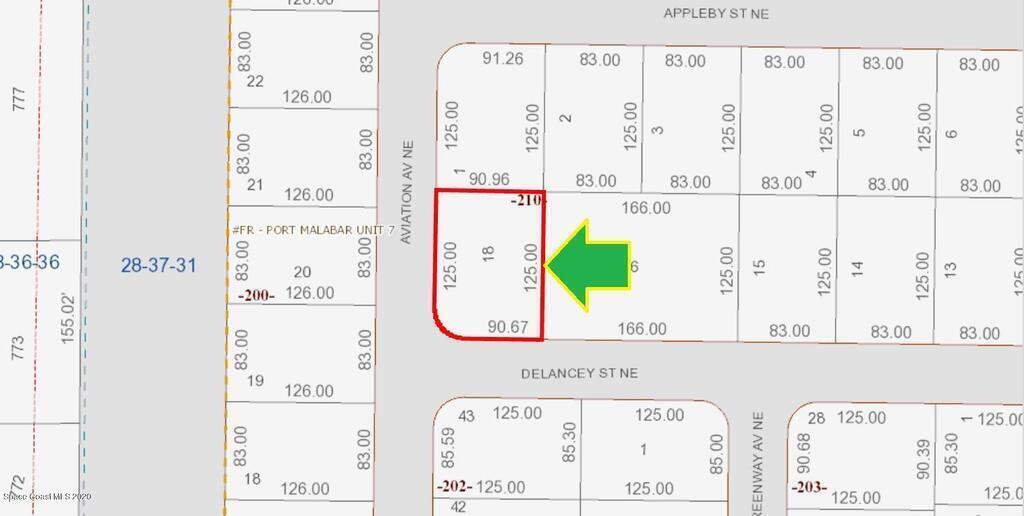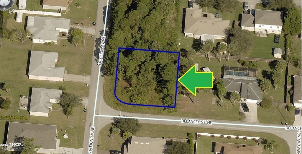 0.26 acre buildable residential lot available in Port Malabar Unirt 7 of Palm Bay. Located in the northeast section, this Corner lot has City Water and Sewer available, and is just .9 miles - 3 minutes to McAuliffe Elementary School, 2.1 miles - 5 minutes to the Walmart Supercenter, 9.4 miles - 21 minutes to Melbourne Airport, and 12.2 miles - 27 minutes to the beaches of Indialantic. From exit #176 of I-95 go west on Palm Bay Road NE for .7 miles, left on Minton Road for 1.7 miles, left on Americana Boulevard NE for 453 feet, right on Aviation Avenue to Delancey Street. The lot will be on the northeast corner on your left.