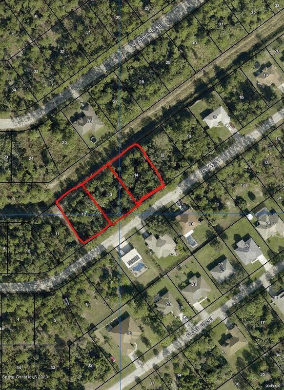 THREE BEAUTIFUL LOTS ALL IN A ROW, TOTALING .69 ACRES! THESE WELL WATER/SEPTIC LOTS ARE BEING SOLD TOGETHER, AS THE PRICE REFLECTS. THE DRAINAGE CANAL TO THE REAR HELPS PROVIDE ADDITIONAL PRIVACY! WELL- LOCATED JUST A FEW BLOCKS FROM THE MAIN ROAD AND CLOSE TO THE BUSY BAYSIDE LAKES AREA FEATURING A GROCERY STORE, DRUGSTORE, DUNKIN, GAS STATIONS, EATERIES AND MORE. JUST MINUTES FROM THE NEW I-95 INTERCHANGE AND MALABAR ROAD WHERE THERE ARE EVEN MORE EVERYDAY CONVENIENCES! (THE LISTING INCLUDES TAX ACCT NUMBERS 2948440, 2945854 & 2945668)