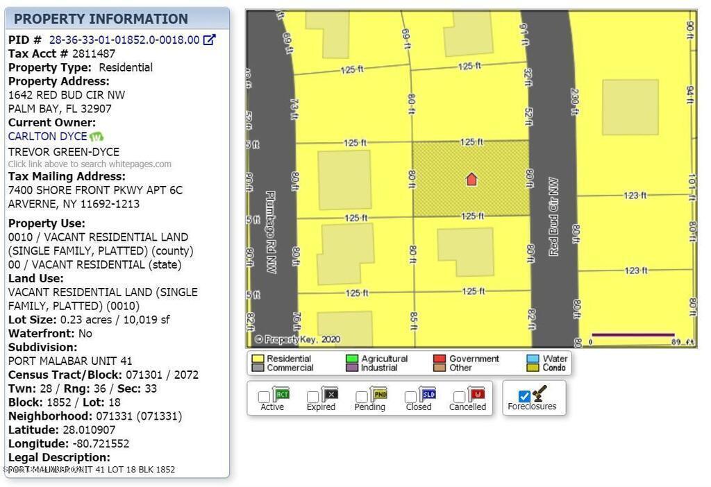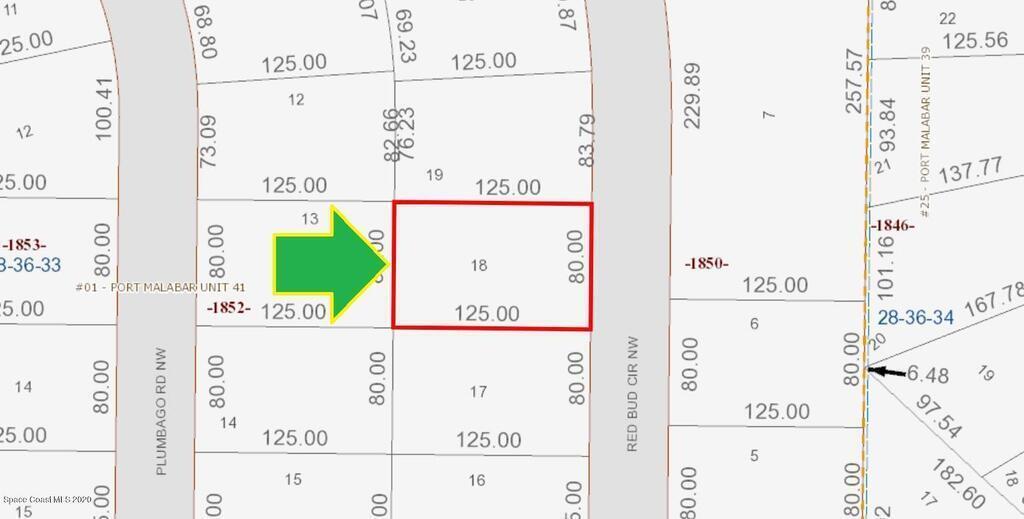 0.23 acre buildable single family residential lot [Rs2 Zoning] available in Port Malabar Unit #41 of Palm Bay. Located in the desirable northwest section close to the Palm Bay Parkway, this lot is just 2.6 miles - 7 minutes to Heritage High School, 3.7 miles - 8 minutes to the Winn Dixie Supermarket, 15.5 miles - 25 minutes to Melbourne Airport, and 16.1 miles - 32 minutes to the beaches of Indialantic. From exit #180 of I-95 go west on US-192 for .5 miles, left on St. Johns Heritage Parkway for 6.1 miles, left on Malabar Road for 1.3 miles, left on Krassner Drive for .9 miles, and right on Red Bud Circle. The lot will be on your left.