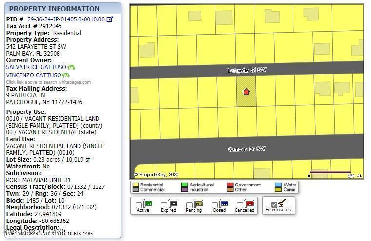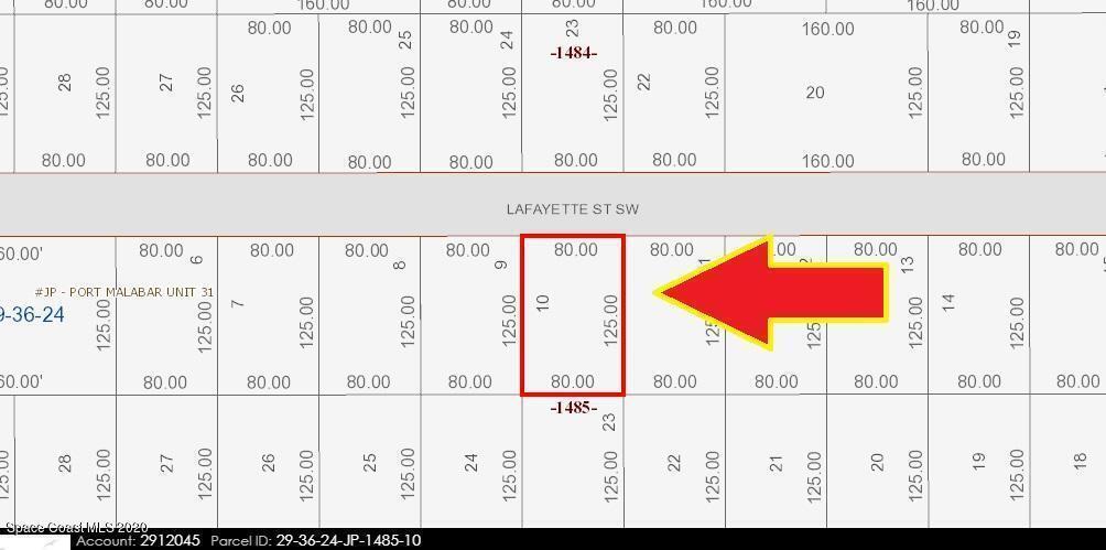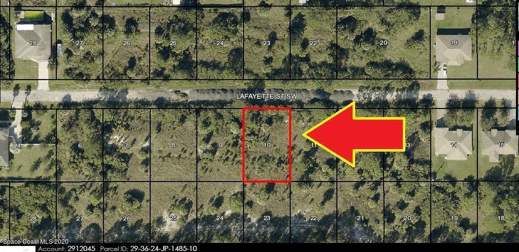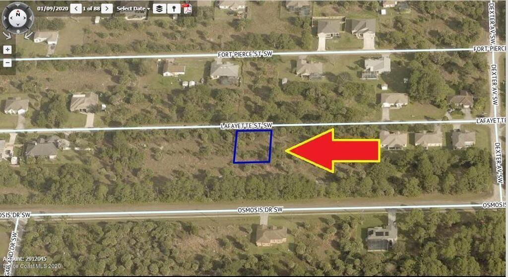 0.23 acre single family residential lot [SRE Zoning for a 1800 sq.ft. minimum home) with city water available located in Port Malabar Unit #31 of Palm Bay. Nicely located in the SW section where the City is now paving roads, this lot is just 1.6 miles -4 minute- to Bayside High and Westside Elementary Schools, 2.9 miles -7 minutes- to Publix Shopping, 6. 9 miles -13 minutes- to the Shoppes of Palm Bay, 11.7 miles -24 minutes- to the Melbourne Square Mall, and just 17.5 miles -34 minutes- to the beaches in Indialantic. From Exit #176 of I-95 go west on Palm Bay Road. Turn left and proceed south on Minton for 3.3 miles. Turn right on Jupiter Boulevard and left on De Groodt Road SW. Proceed south for 3.3 miles and turn right on Osmosis Drive, Right on Dexter Avenue and left on Lafayette St.