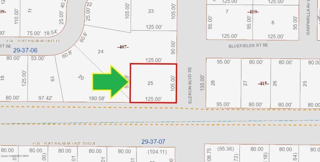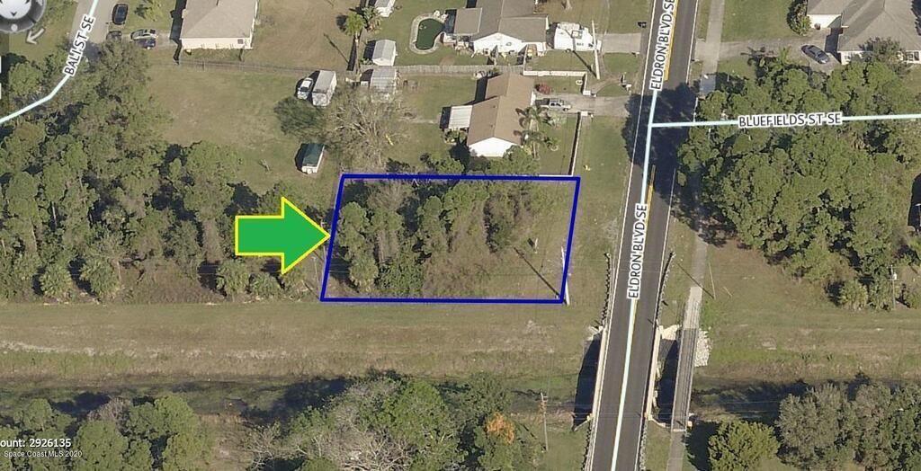 [[Corner lot on Eldron !!]] Over-sized 0.30 acre buildable single family residential lot available in Port Malabar Unit #10 of Palm Bay. Located in the southeast section, this lot has City Water available and a drainage canal on the side allowing more privacy, and is just .3 miles - 1 minute to Turner Elementary School, 2.3 miles - 5 minutes to the Walmart Supercenter, 11.2 miles - 25 minutes to Melbourne Airport, and 12.4 miles - 30 minutes to the beaches of Indialantic. From exit #173 of I-95 go west on Malabar Road NE for .2 miles, left on San Filippo Drive for .5 miles, right on Jupiter Boulevard SE for 1.7 miles, and left on Eldron Boulevard. The lot will be on your right.