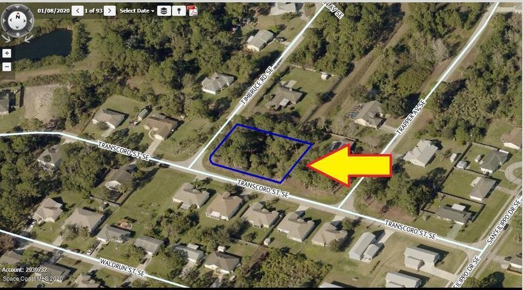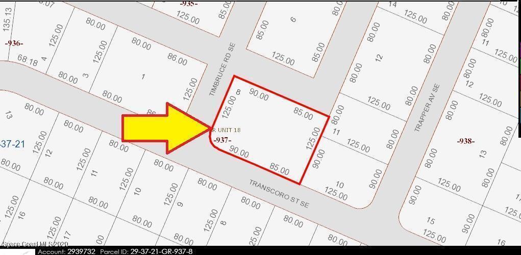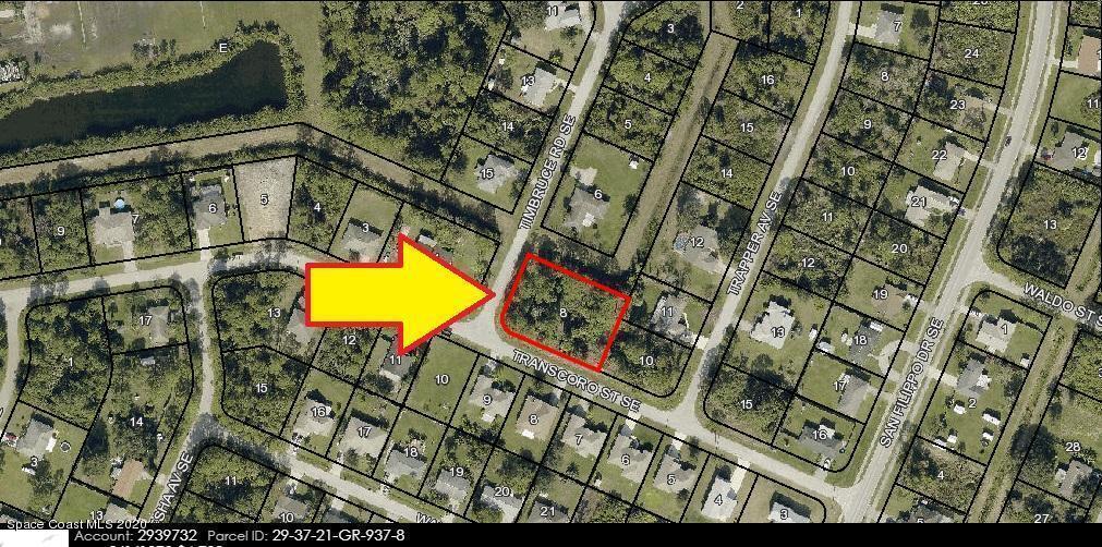 --1/2 acre-- [[Two lots with the corner]] 0.50 acre double lot (Lots #8 and #9) zoned single family residential (Rs2 Zoning) available in Port Malabar Unit #18. Nicely located in the SE Section near Bayside Lakes and the PGA Majors Golf Course, these lots are just 2.8 miles -7 minutes- to Publix Shopping, 4.3 miles -9 minutes- to Bayside High and Westside Elementary Schools, 11.7 miles -23 minutes- to the Melbourne Square Mall, and just 13.1 miles -26 minutes- to the beaches in Indialantic. From Exit #173 of I-95 go west on Malabar Road NE. Turn left on San Filippo Drive SE and proceed south for 3.7 miles. Turn right on Transcoro Street SE and proceed to the corner of Transcoro Street and Timbruce Road on the right.