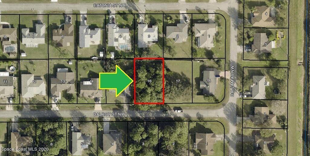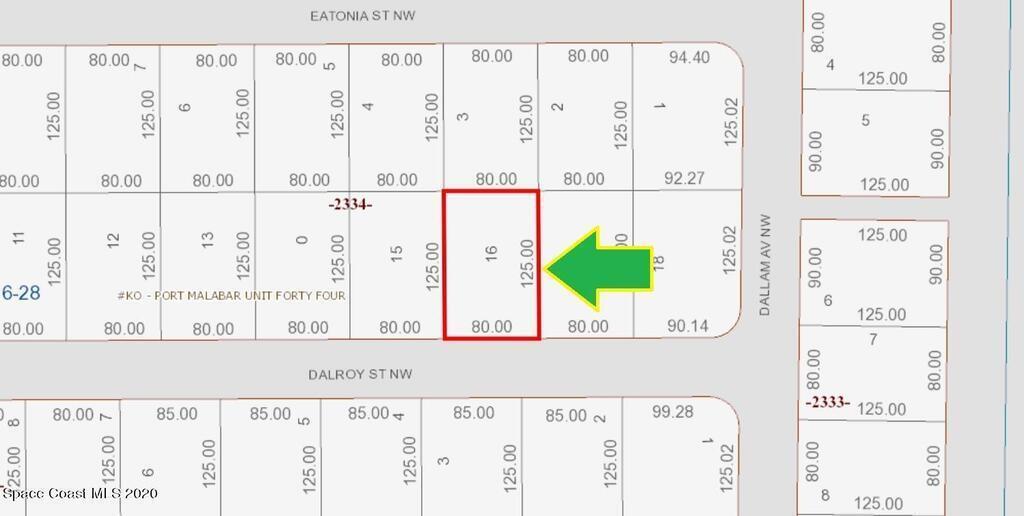 0.23 acre buildable single family residential lot [Rs2 Zoning] available in Port Malabar Unit #44 of Palm Bay. Nicely located in the northwest section, this lot has City Water available, and is just .8 miles - 4 minutes to Discovery Elementary School, 4.5 miles - 12 minutes to the Publix Supermarket, 12.2 miles - 23 minutes to Melbourne Airport, and 14.5 miles - 31 minutes to the beaches of Indialantic. From exit #180 of I-95 go west on US-192 W for .5 miles, left on St. Johns Heritage Parkway for 3.8 miles, left on Emerson Drive NW for .7 miles, right on Baca Avenue for .5 miles, right on Fairlight Street for .1 mile, left on Bowsprit Avenue for .1 mile, and right on Dalroy. The lot will be on your right.