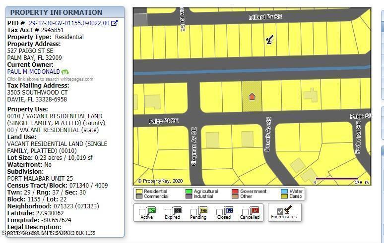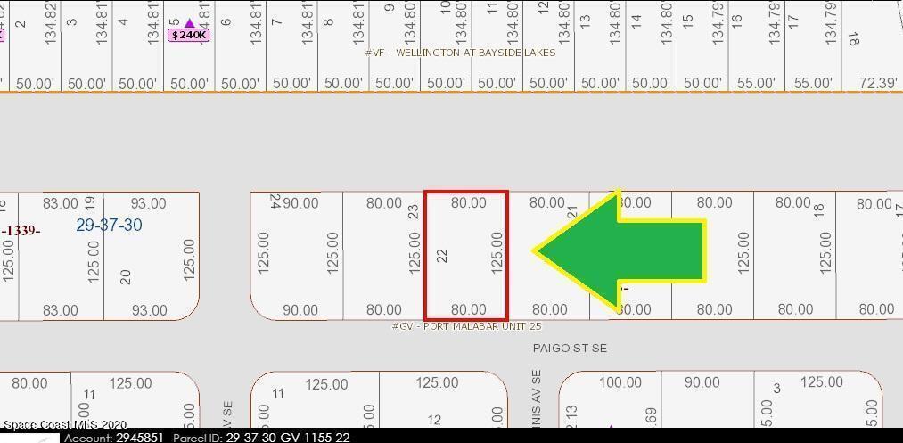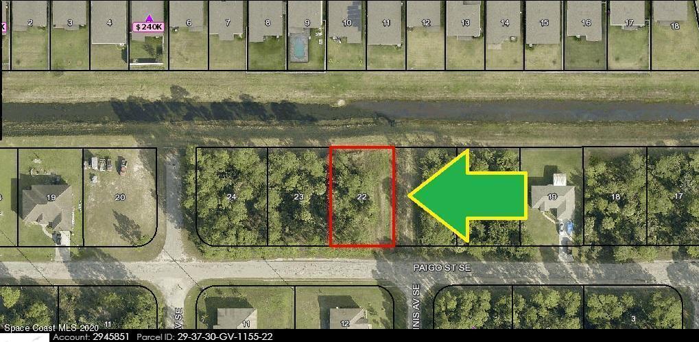 0.23 acre single family residential lot [Rs2 Zoning] with a drainage right-of-way easement canal in the back of the property available in Port Malabar Unit #25. Nicely located in the SE Section of Palm Bay south of Bayside Lakes Subdivision, this lot is just 2.4 miles -6 minutes- to Publix Shopping, about the same to Bayside High and WestSide Elementary Schools, 16 miles -32 minutes- to the beaches in Indialantic, and 70 minutes to Orlando International Airport. From Exit #173 of I-95 go west on Malabar Road NE. Turn left on San Filippo Drive SE and proceed 5.7 miles south. Turn right onto Cogan Drive and left onto Paigo Street SW. Proceed to 527 Paigo Street SE on the north side of the road. Latitude 27.930062 Longitude -80.657624