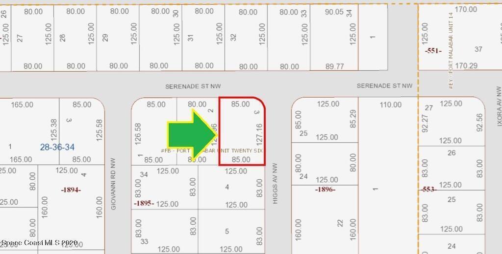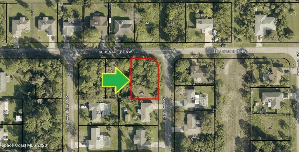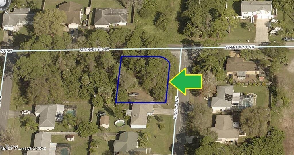 Oversized 0.25 acre buildable single family residential lot [Rs2 Zoning] available in Port Malabar Unit #26 of Palm Bay. Located in the northwest section, this Corner lot is just 3.2 miles - 7 minutes to McAuliffe Elementary School, 4.1 miles - 10 minutes to the Publix Supermarket, 10.8 miles - 23 minutes to Melbourne Airport, and 13.4 miles - 28 minutes to the beaches of Indialantic. From exit #176 of I-95 go west on Palm Bay Road NE for .7 miles, left on Minton Road for .2 miles, right on Emerson Road NW for 1.5 miles, left on Jupiter Boulevard for 1.3 miles, and right on Serenade Street. The lot will be on your left on the southwest corner with Higgs Avenue.