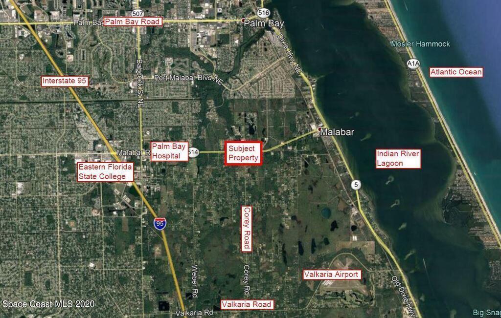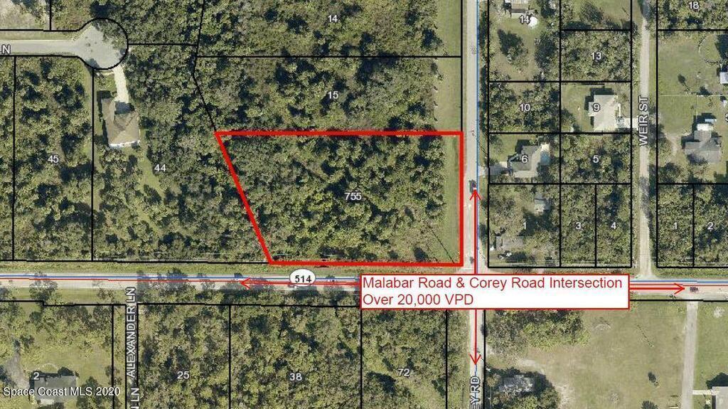 Excellent opportunity to purchase a +/- 2.49 acre corner property in the heart of Malabar! Est. 373' frontage on Malabar Road x 256' depth on Corey Road. Per Seller, City Water available via next door Stillwater Preserve Subdivision. Traffic count est. 15,300 VPD on Malabar Road. Straight shot to US1, Babcock Street, Interstate 95 and St. Johns Heritage Parkway. Health First Palm Bay Hospital and Eastern Florida State College are nearby. Lots of schools, restaurants, daycares and businesses in the area.